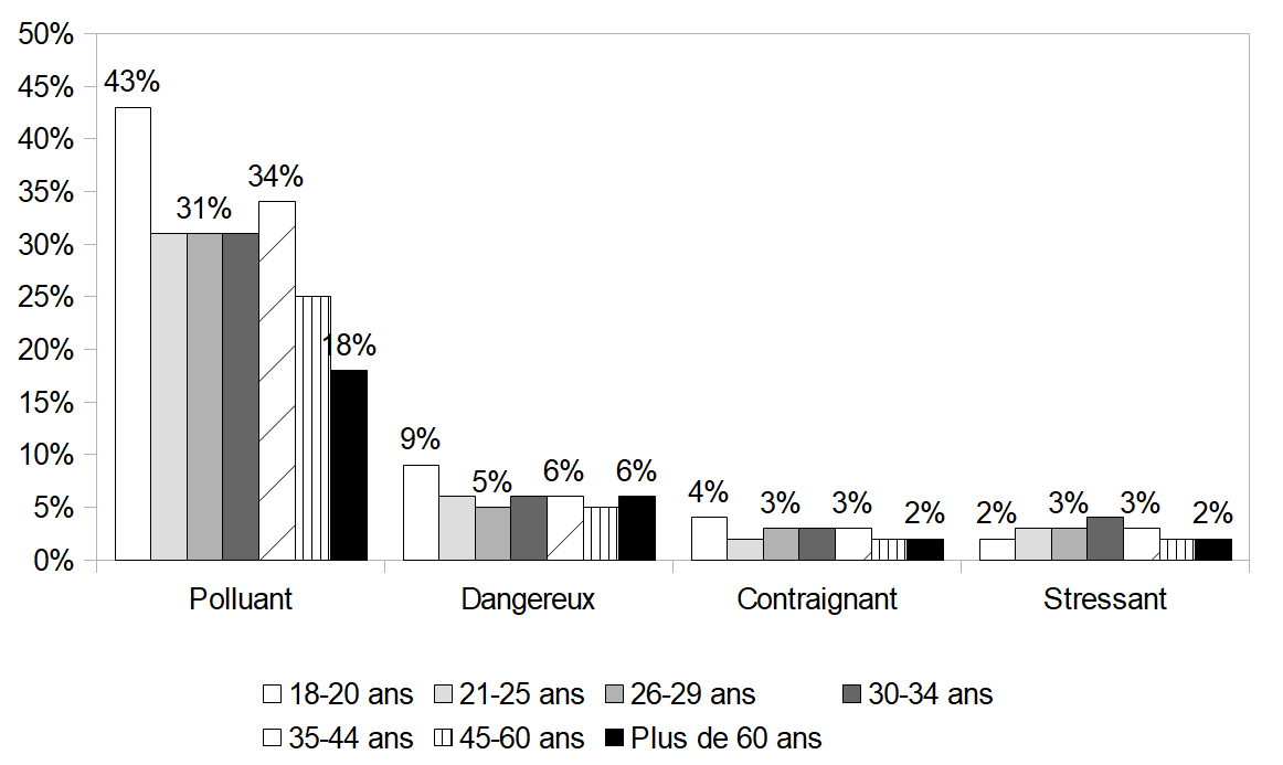 Lecture : sur 100 personnes âgées de 18 à 20 ans, 43 jugent la voiture polluante.
