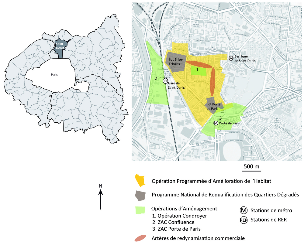 Les deux secteurs visés par le projet ont été choisis non seulement en raison de leur forte dégradation, évaluée à partir d’un indicateur de parc privé potentiellement indigne (PPPI) [11], mais également « pour leur positionnement stratégique en entrée de ville et à proximité immédiate de deux opérations d’aménagement » [12]. Si ce choix est justifié par des arguments techniques, c’est avant tout la volonté politique de revaloriser le centre de Saint-Denis et de transformer son peuplement qui prévaut, sachant que l’habitat dégradé est très présent aussi dans d’autres quartiers de la ville. La convention pointe ainsi « un risque de décrochage [du centre] par rapport aux évolutions positives escomptées des grands projets urbains engagés à proximité », les zones d’aménagement concertées (ZAC) Confluence et Porte de Paris.