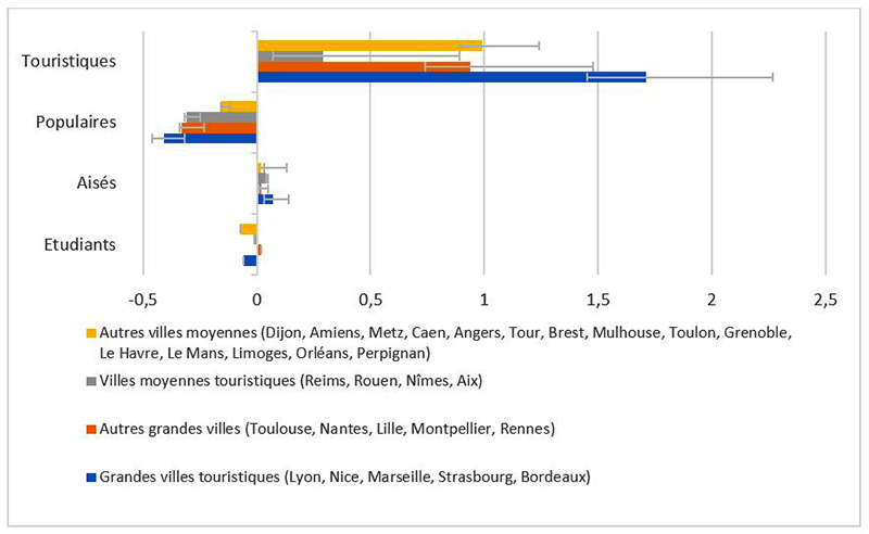 – Contrairement à ce que la littérature académique suggère en focalisant sur quelques cas de villes particulièrement touristiques, toutes les catégories de villes sont, à divers degrés, concernées par une structure similaire des préférences de voisinage des touristes : une forte prime accordée aux quartiers touristiques et une prime (significative) très faible accordée aux quartiers aisés ; une assez forte décote des quartiers populaires et une décote faible mais significative des quartiers étudiants.