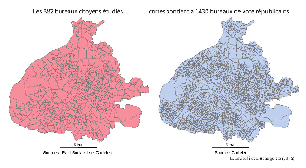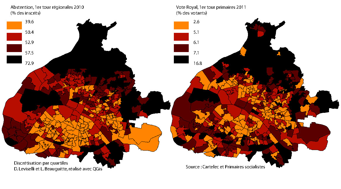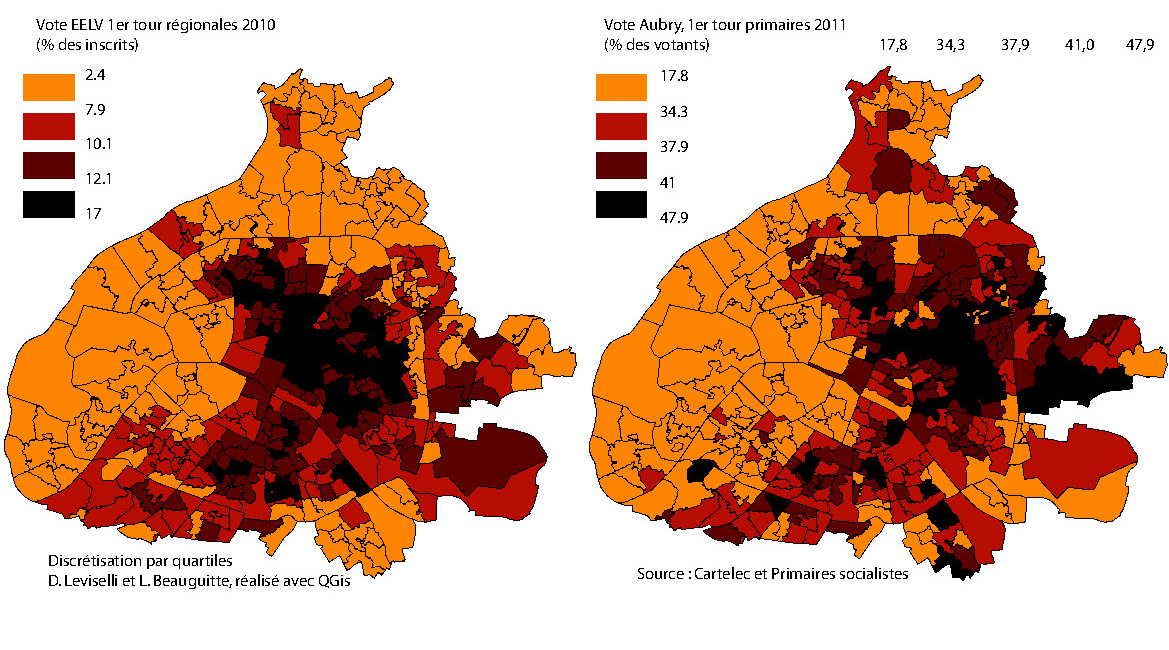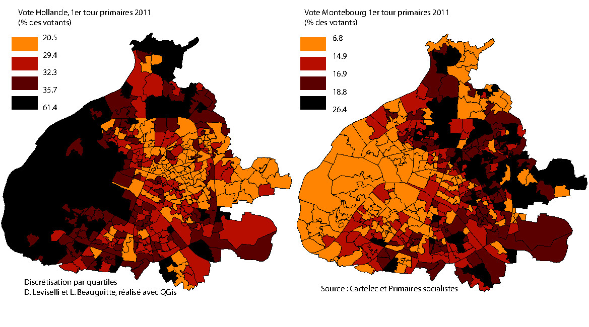 Dès décembre 2011, Jérôme Fourquet a proposé une analyse exhaustive à l’échelle départementale accompagnée de zooms à l’échelle communale. Il note que la mobilisation croît avec l’urbanisation et l’encadrement militant, alors qu’elle reste faible dans les départements « en crise » ou dans les banlieues populaires, mettant également en évidence la reproduction d’affinités locales internes à l’appareil socialiste dans les choix des sympathisants (Fourquet 2011). Julien Audemard et David Gouard, cherchant à cerner la population se déplaçant pour les primaires citoyennes, ont, de leur côté, conduit une enquête de terrain intensive le jour du scrutin dans deux bureaux montpelliérains, croisant leur résultats et les profils socio-démographiques de l’ensemble des bureaux de la ville. Ils montrent une surreprésentation des populations âgées ou favorisées parmi les votants et, inversement, une désaffection des milieux populaires et des plus jeunes. Ils confirment l’importance des propriétés sociales des participants sur l’orientation de leurs votes : les propriétaires installés de longue date préfèrent François Hollande, les jeunes diplômés locataires optent plutôt pour Arnaud Montebourg, tandis que Ségolène Royal obtient ses meilleurs scores dans les quartiers populaires (Audemard et Gouard 2014). En comparant à l’échelle du bureau de vote la géographie électorale issue de ce scrutin avec celle traditionnellement observée dans l’espace parisien (cf. encadré), elle-même reflet des configurations sociales locales (Rivière 2012), nous cherchons à éclairer les comportements électoraux observés lors de cette consultation inédite [2].