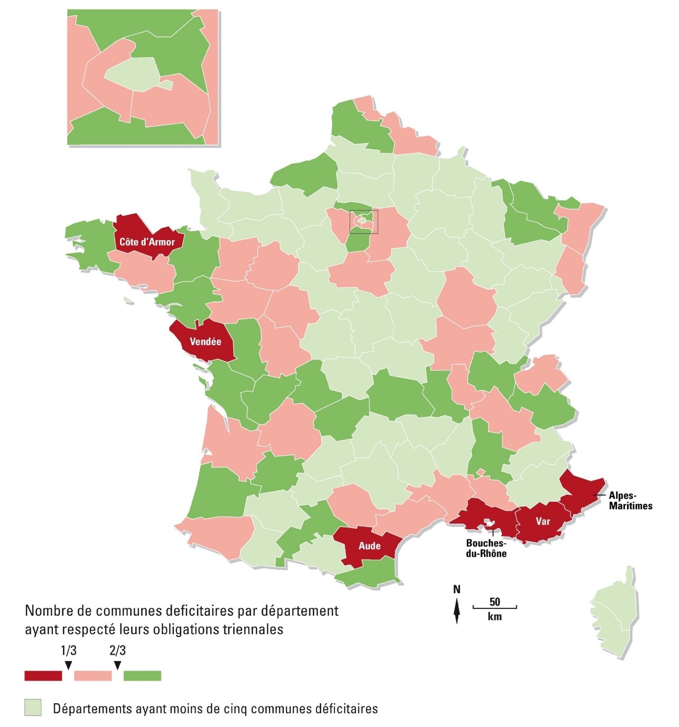 Dans ce jeu d’acteurs, le préfet tient une place à part (Driant 2001). En tant que représentant de l’État sur le terrain, il veille au respect de la loi, tout en tenant compte des difficultés d’application de l’article 55. D’où la stratégie « de la carotte et du bâton » qu’il mène à l’égard des communes déficitaires. Il offre ainsi des solutions aux communes volontaires, en leur proposant, par exemple, de vendre à la décote certains terrains appartenant à l’État. Inversement, il prononce un « constat de carence » à l’encontre des communes déficitaires qui, en plus de ne pas avoir respecté leurs obligations triennales, n’ont pas – à ses yeux – fourni les efforts ad hoc. Le représentant de l’État utilise toutefois cette arme avec précaution : à l’échelle nationale, sur les 526 communes déficitaires n’ayant pas atteint leurs obligations de construction pour la période 2014-2016, 257 ont été épargnées et 269 ont été sanctionnées par un « constat de carence ». Ces communes « carencées » sont alors amputées de certaines de leurs prérogatives urbanistiques, en particulier de leur droit de préemption. Elles s’exposent en outre au risque d’une multiplication par cinq de leur prélèvement annuel, cette « amende » dont doivent s’acquitter les communes déficitaires et qui équivaut à 20 % du potentiel fiscal par habitant multiplié par le nombre de logements sociaux manquants.