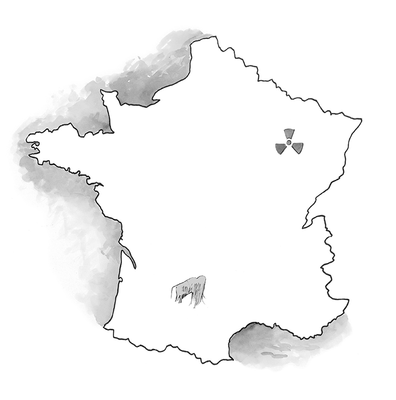 En guise de préface, l’ouvrage commence par une page blanche avec en son centre la France, représentée par une simple frontière au trait noir, et deux symboles, celui d’un mammouth et celui de la radioactivité (figure 1). Cette carte synthétique résume l’objectif de ce roman graphique : lier ces deux traces et un temps très long. C’est en immergeant le lecteur sur les sentiers de grande randonnée, comme il a pu les parcourir, que l’auteur questionne les héritages que les « strates humaines » (p. 19) lèguent au sol, au sous-sol et donc au territoire et aux populations futures. Ces patrimoines associent un « croquis évident, libre et précis » (p. 20) de mammouth préhistorique dans la grotte de Pech Merle et la sophistication des déchets radioactifs du projet d’enfouissement nucléaire de Bure. L’ouvrage décrit plusieurs facettes de cette randonnée qui relève à la fois d’une forme d’engagement, d’une démarche d’enquête et d’une expérience sensible.