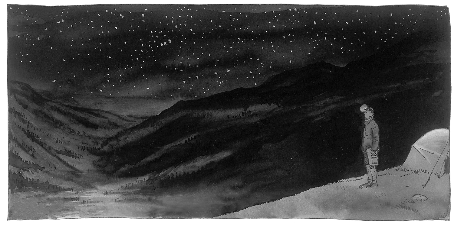 Cet ouvrage fait état de l’expérience sensible que représente la marche. Une « expérience de la solitude » (p. 55) et de la lenteur qui permet de « s’arracher au quotidien pour revenir à un état antérieur qui nous est commun où on pourra peut-être se retrouver soi-même » (p. 31). Dans cette posture en disponibilité sensorielle, le narrateur apporte une attention particulière au paysage qui l’entoure. Cela transparaît autant par le récit que le dessin. Certaines cases s’étendent sur toute la largeur de la page, tracent parfois des panoramas sur les vastes paysages traversés. Ces dessins constituent des respirations tant pour l’auteur qui fait une halte sur le chemin que pour le lecteur, suggérant les ambiances parcourues. Cette expérience géographique oscille entre la topographie des crêtes du cantal à 1888 mètres et les plaines où l’on peut ressentir « un vertige d’herbe et de silence » (p. 146). Pour favoriser l’immersion, les descriptions des paysages sont souvent associées aux « météores » (de la Soudière 2019) : le vent dans les herbages sans limites (p. 84), la brume matinale enveloppant les reliefs (p. 68), « les moments qui précèdent l’orage » (p. 130) ou encore cette chaleur écrasante lors de l’épisode caniculaire précoce fin juin 2019 (p. 89). D’un point de vue graphique, malgré l’absence de couleurs, les dessins réalisés avec un lavis de niveaux de gris viennent rendre compte des lumières comme : le soleil brillant d’un début d’après-midi (p. 105), les ombres franches de l’été (p. 172), les couchers de soleil (p. 87) ou les ciels étoilés (p. 59, figure 2). Les sens sont aussi convoqués, on écoute avec l’auteur le chant de l’alouette et l’air immobile qui vibre en sourdine (p. 130), on goûte des abricots les pieds dans une rivière (p. 93) et on frôle le feuillage du bois Lejuc (p. 199). Il partage également l’influence de cette expérience sur l’état du corps face à « la chaleur, la soif, la poussière, la boue, l’inconfort et la fatigue » (p. 28). Il partage les aventures du marcheur comme : « la douche au vent » (p. 56), les signes de douleur des mollets ou des clavicules (p. 32), le choix méticuleux des emplacements de bivouac. Ces éléments peuvent paraître anecdotiques, mais ils nous immergent dans l’expérience de la marche. Ces témoignages corporels pragmatiques et personnels favorisent l’empathie du lecteur pour le personnage et pour les lieux qu’il habite pendant son voyage (p. 65).