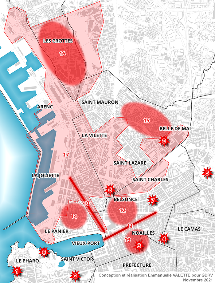 Les cœurs des métropoles sont aujourd’hui l’objet de conflits d’appropriation de l’espace et de construction de frontières sociales et territoriales, même s’ils n’en sont pas l’unique terrain. Ces espaces centraux sont bousculés par des tendances en apparence contradictoires : entre concentration des ressources et des pouvoirs dans certains quartiers, dilution de cette « centralité » dans des réseaux et formes urbaines diffuses, et émergence de centralités alternatives (Roncayolo 1990 ; Bourdeau-Lepage, Huriot et Perreur 2009 ; Pradel, Padeiro et Aguilera 2014) [1]. Considérée comme une exception française de par sa centralité populaire et l’imaginaire de conflits qui l’entoure, Marseille offre un terrain propice pour étudier les tensions et les concurrences qui entourent les centres-villes.