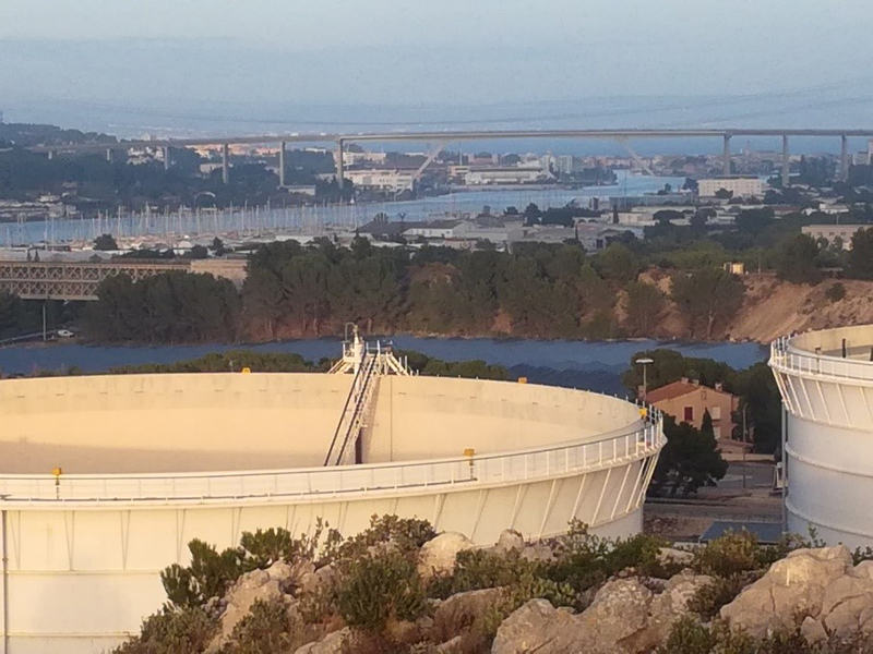 Duperrex est le seul à placer l’analyse de ces transformations sous le signe explicite de l’anthropocène (p. 15). Mais les deux autres livres s’y rattachent implicitement, en s’intéressant comme lui aux quatre éléments qui composent ce milieu artificialisé : le feu des fourneaux et des distillateurs, qui s’échappe spectaculairement des cheminées, d’où le thème de l’entrée des enfers mobilisé par Claire Dutrait ; l’air, avec le mistral, ce vent furieux qui bat le site et emporte les fumées et autres rejets aériens (« les lâchers bruyants et méphitiques de vapeur industrielle », Duperrex, p. 129) ; l’eau, dont le bleu aquarelle orne les dessins et les cartes marines de Bertran de Balanda, l’eau transformée en saumure mise sous pression dont Duperrex retrace les circuits complexes, l’eau polluée par les rejets d’hydrocarbure ; enfin, le sol : mou et vaseux de la rive de Caronte qu’il a fallu stabiliser, rocheux des collines qui encadrent le site (« ce poudingue ferreux du littoral, caillou rougeâtre dense, lourd, au faciès criblé et grenu », Duperrex, p. 130).