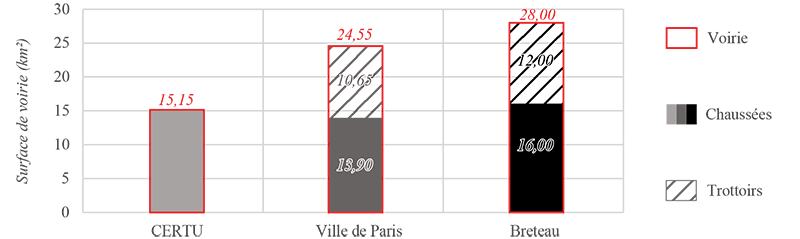Le manque d’une vision cohérente de la voirie empêche d’identifier son emprise précise et conduit à des estimations différentes. Ainsi, la surface de voirie de Paris est estimée entre 28 km² (Ville de Paris 2020 ; Breteau 2016) et 15 km² (CERTU 2013), selon que les dépendances y sont incluses ou non (figure 2).