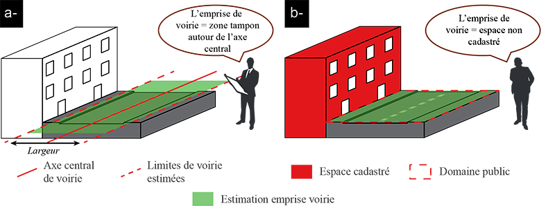 - l’Institut Paris Région s’est intéressé récemment aux informations cadastrales pour identifier l’espace public et, par relation, les emprises de voirie (Delaville et al. 2021) (figure 3b).