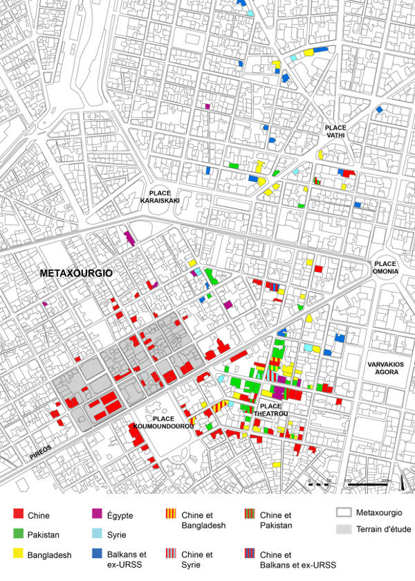 Il faut prendre en compte les caractéristiques de ce quartier pour en comprendre l’attractivité pour ces migrants ; jusqu’au milieu du XXe siècle, il est habité par une population ouvrière et l’activité artisanale y est importante (Agriantoni 1995). Depuis 1980, Metaxourgio connaît un déclin de ces activités et un changement de sa composition démographique avec l’arrivée de différents groupes migratoires. L’installation massive des entreprises chinoises entre 2000 et 2005 est ainsi directement liée aux nombreux espaces commerciaux vacants et aux prix relativement faibles de l’immobilier, qui découlent directement de ces mutations récentes.