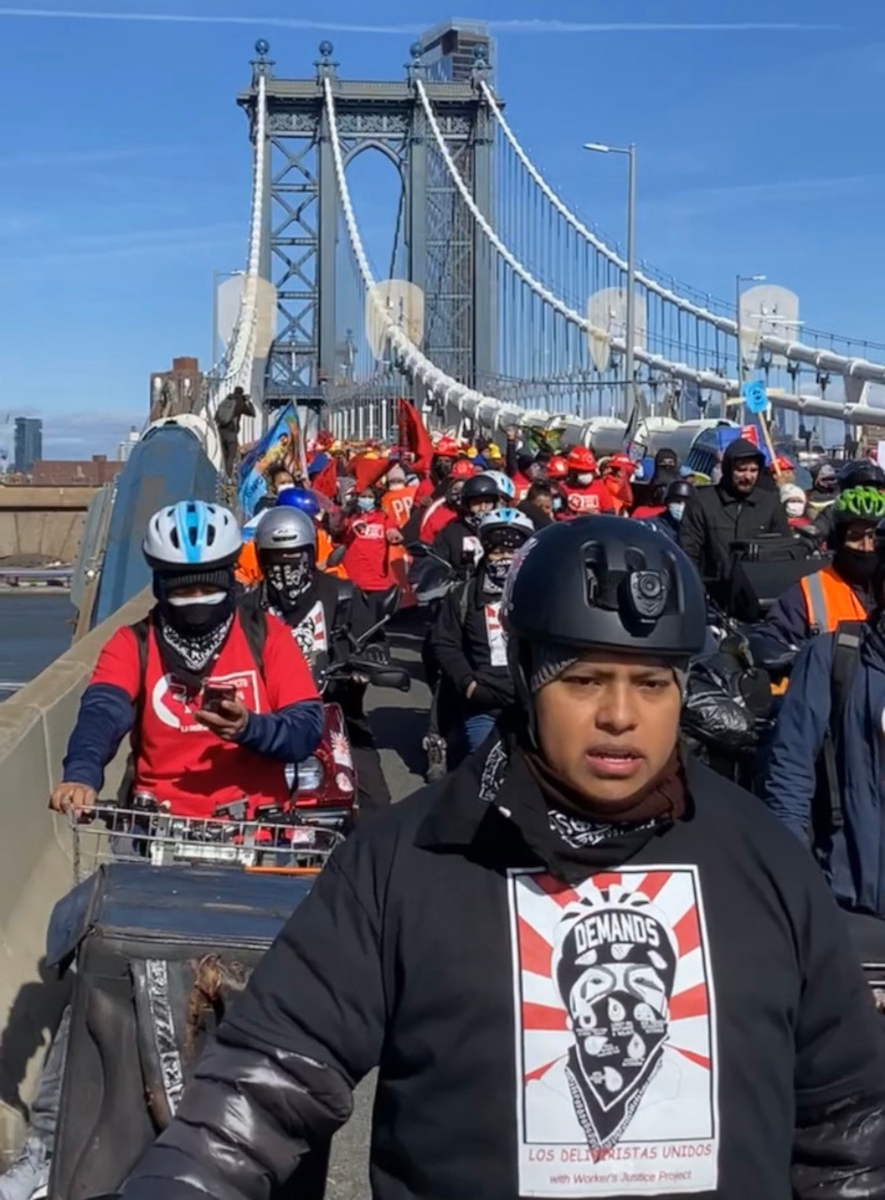 Although these changes to our infrastructure have made many app-based jobs easier, workers in this industry still must work around the algorithm, which alienates deliveristas from one another. For the applications, deliveristas ideally work independently from one another, compete with one another, and work over large geographical areas. Still, the algorithms push deliveristas to congregate around high-demand areas (usually points in the city where several fast-food places are adjacent to one another). These areas have served as focal points in deliveristas’ organizing strategy, where they typically organize themselves into WhatsApp or WeChat groups. During the pandemic shutdowns, deliveristas in New York City used these chat groups to begin asserting their identity as “essential workers,” and later took to social media to raise awareness about their working conditions. Deliveristas who came together in Lower Manhattan at this time founded Los Deliveristas Unidos (LDU) with the Workers’ Justice Project, a workers’ center that also organizes construction and domestic workers. These deliveristas began gathering as much of their own data as possible, asking fellow deliveristas to screenshot their earnings, distance traveled per order, and other information that could be used to narrow the information gap between the corporations and the deliveristas. Some have started using mapping software as a tool by using a social media application called Zenly. This app allows a user to see the location of their friends and send voice messages, which deliveristas use to organize and protect one another from theft.