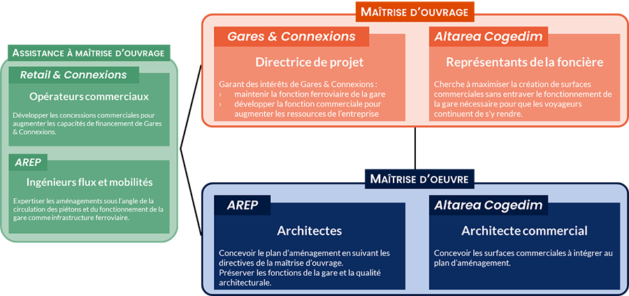 Tu as suivi les débats qu’on a depuis un an […]. Au fond, ça se résume à ça : une gare ou un centre commercial ? On cherche à amener les voyageurs aux trains […], Altarea souhaite les amener aux commerces. […] On doit trouver un juste milieu pour contenter les deux (cheffe de projet, AREP, entretien réalisé le 30 mars 2020).
