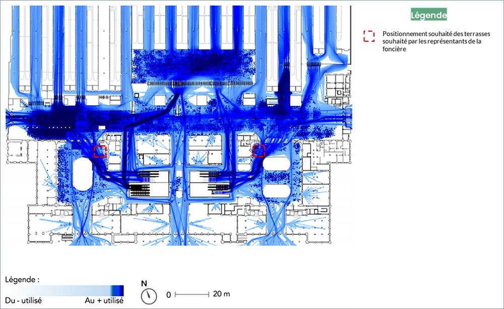 Cette demande n’a jamais été évoquée auparavant et prend de court la directrice de projet. Elle propose une première réponse purement technique : la simulation dynamique permettra de voir l’intensité de la circulation à cet endroit de la gare (figure 3) et donc de trancher l’opportunité d’y ajouter une terrasse. Le directeur du commerce de flux chez Altarea Cogedim n’abandonne pas si facilement et insiste pour que la terrasse soit simulée. Le cadre exécutif se joint à la négociation et appuie son collègue.
