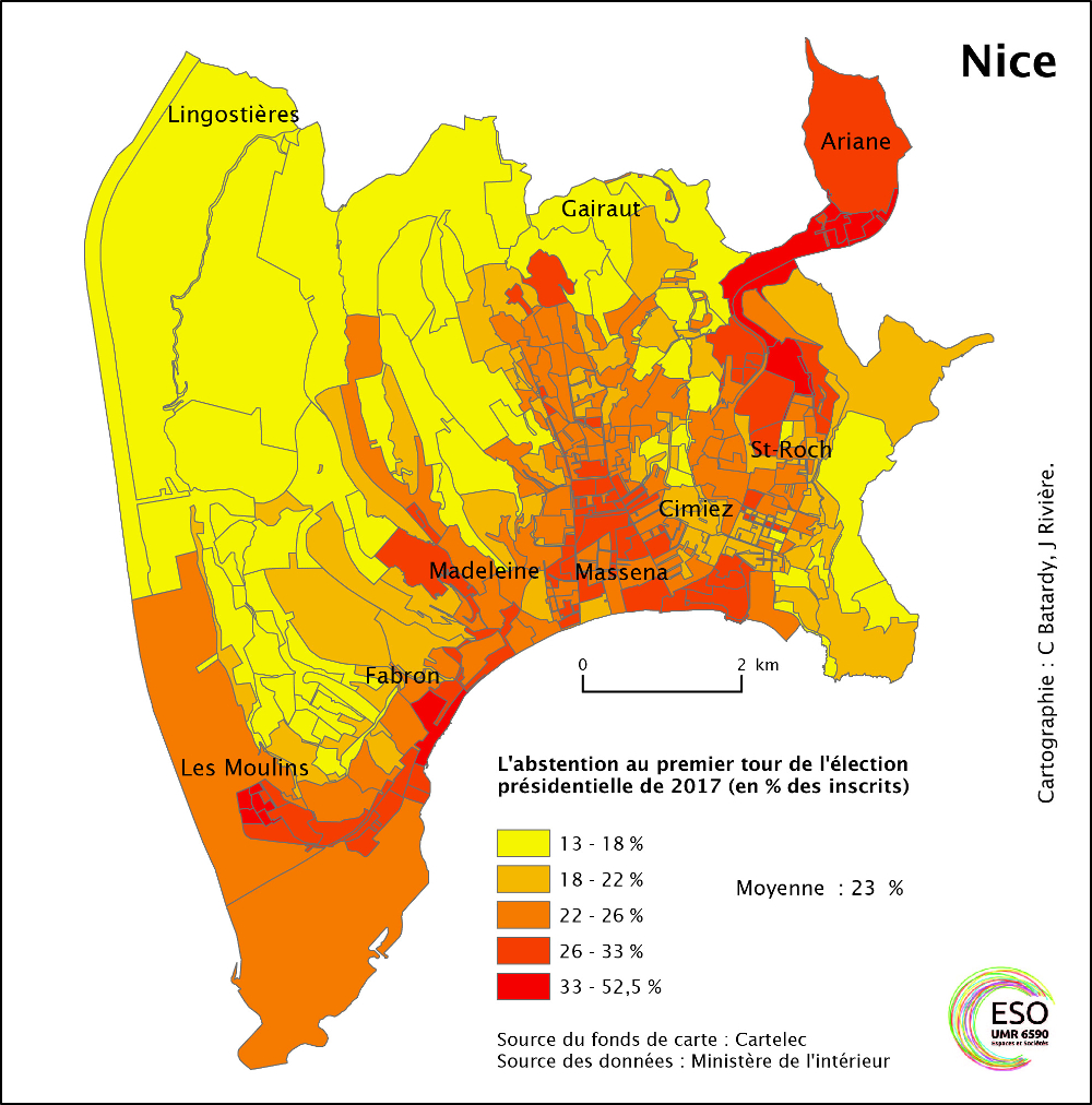 Le leadership sur la ville a en fait été âprement disputé lors de ce scrutin présidentiel, en premier lieu par Marine Le Pen. Arrivée en tête dans 108 communes sur 163 dans les Alpes-Maritimes (principalement dans l’arrière-pays), la candidate du Front national a gagné à Nice 3 000 voix par rapport à 2012 pour talonner F. Fillon (avec 25,2 % des suffrages exprimés et 18,9 % des inscrits). Ce résultat confirme l’ancrage niçois de l’extrême droite déjà éprouvé lors des élections régionales de 2015, même si le FN n’est toujours pas parvenu à conquérir de mandats locaux autres que municipaux. Dans les bureaux de votes, la géographie des voix obtenues par M. Le Pen (carte 3) est fortement corrélée avec celle observée en 2012 (r = 0,89).