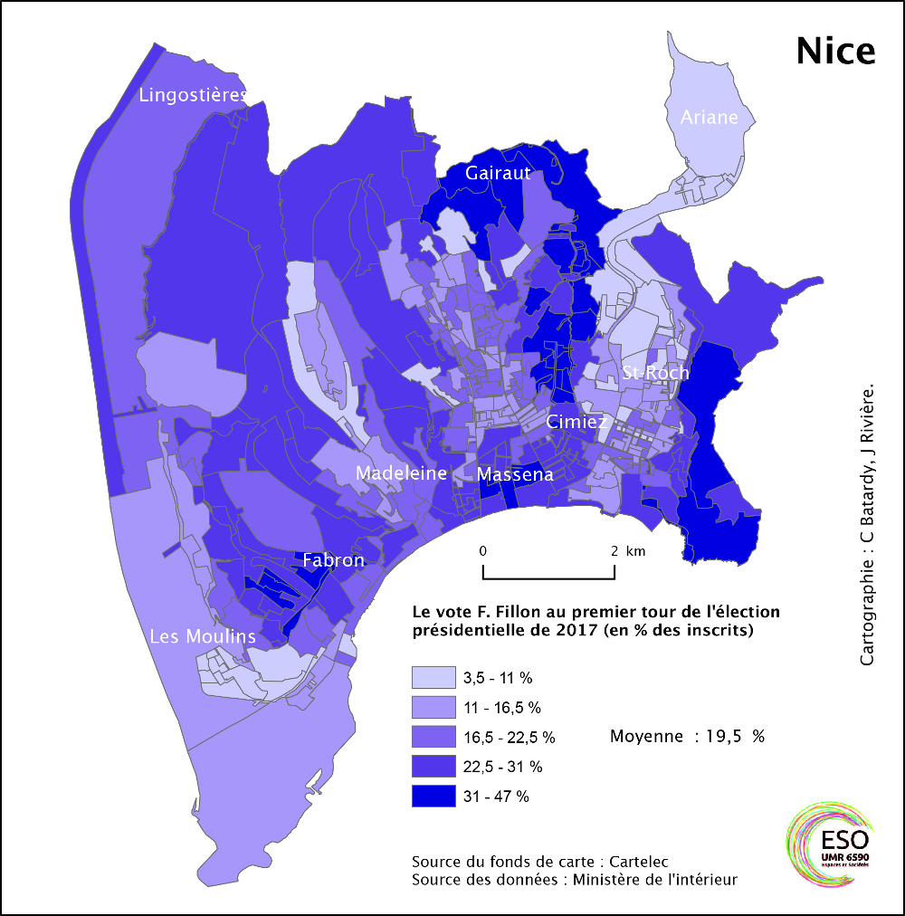 Les élections présidentielles de 2017 ne semblent pas avoir échappé au constat d’ancrage à droite du sud-est de la France. François Fillon réalise dans les Alpes-Maritimes son troisième meilleur score départemental (27,4 % des suffrages exprimés) après la Sarthe (29,1 %), le département dont il est originaire, et les Hauts-de-Seine (28,6 %), le département le plus riche de France. À Nice, le candidat LR vire également en tête avec 26,1 %, soit 6 points de plus que son résultat à l’échelle nationale. Parmi les 20 plus grandes villes françaises, c’est dans cette cité qu’il obtient son résultat le plus élevé après Paris. À l’évidence, Nice a encore manifesté un « penchant droitiste », confirmant l’identité politique « conservatrice » que lui ont reconnue des commentateurs de la vie politique locale (Barelli 1991 ; Basso 2006). Le candidat des Républicains avait d’ailleurs choyé ce fief traditionnel au cours de sa campagne en y organisant deux de ses meetings, le 11 janvier puis le 17 avril, quelques jours avant le premier tour. Il avait également intégré dans son équipe de campagne le président du conseil départemental, Éric Ciotti, et le maire de Cannes, David Lisnard. Cet ancrage de la droite dans le territoire maralpin a pourtant été sérieusement écorné lors du scrutin présidentiel.