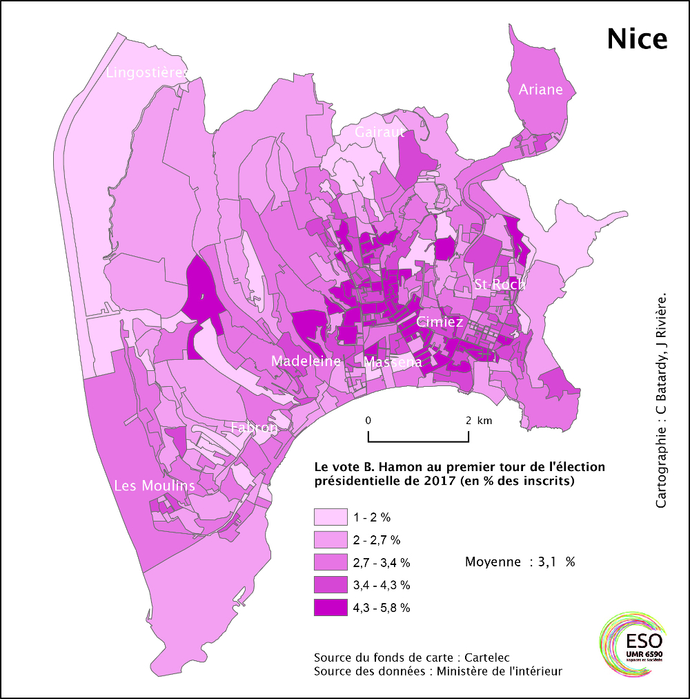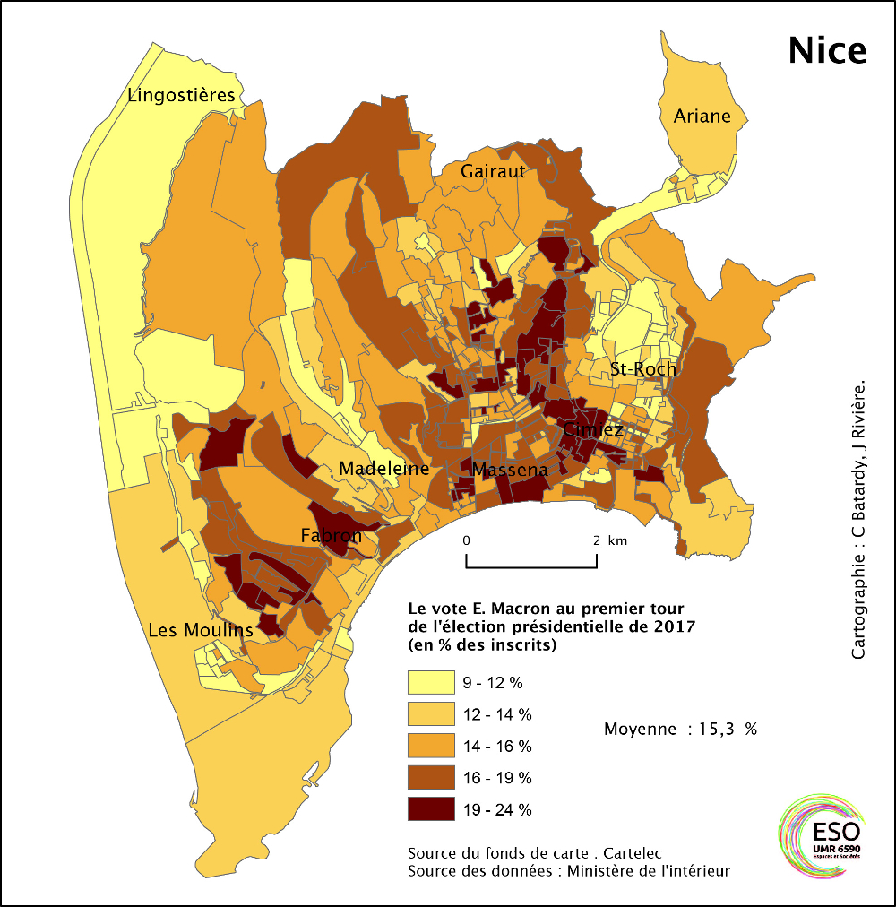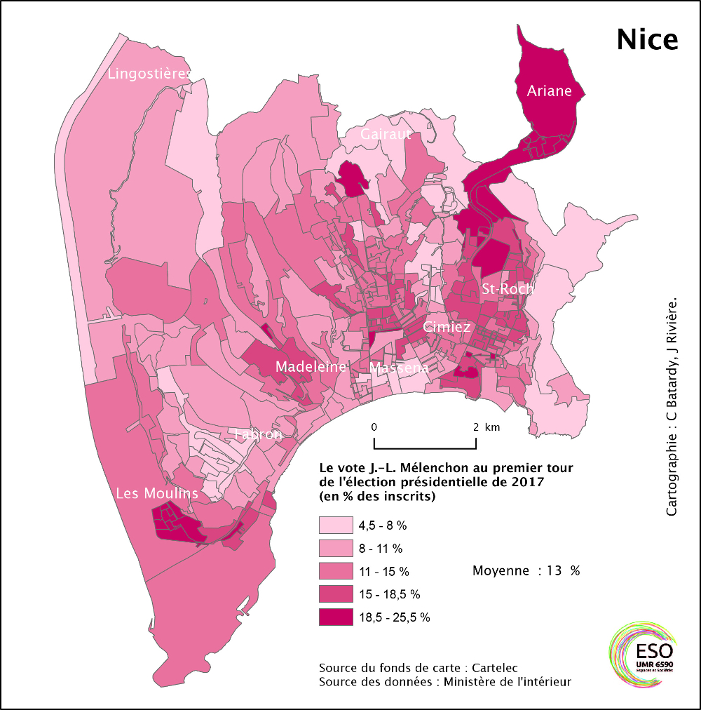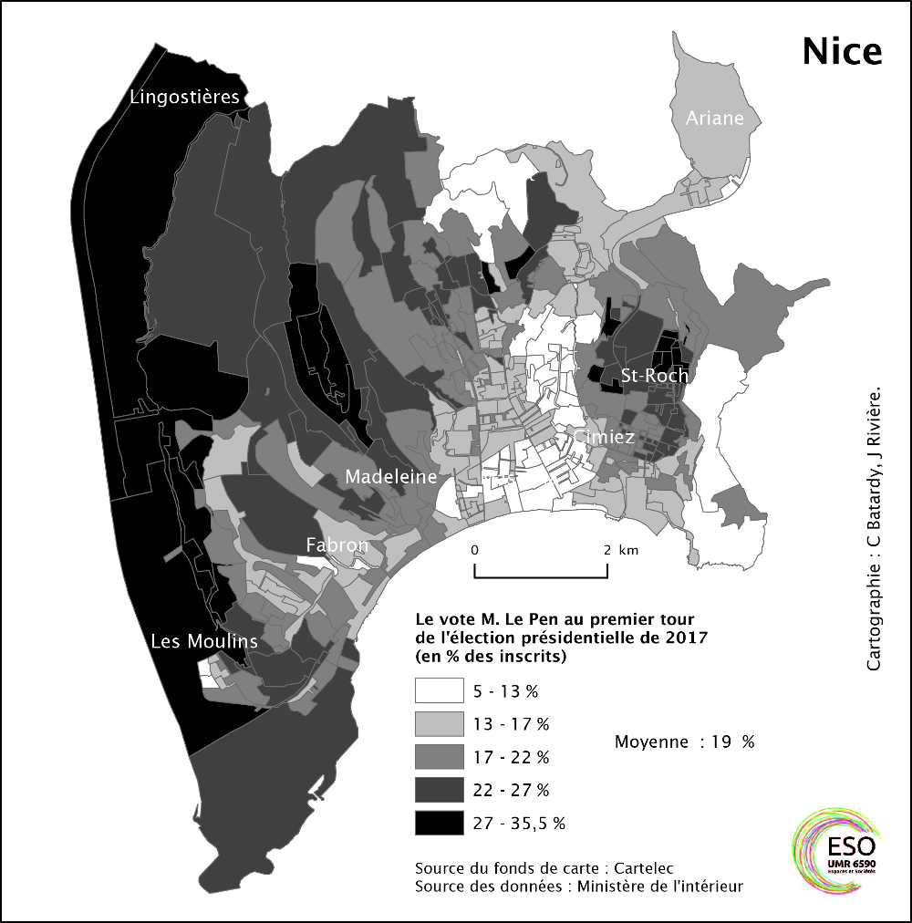 La candidate du FN a obtenu ses meilleurs scores dans des quartiers d’habitat social ou à leur immédiate proximité (comme aux Moulins et à l’Ariane, où elle est néanmoins fortement concurrencée par Jean-Luc Mélenchon, souvent en tête). Elle est également bien implantée dans des quartiers péricentraux peuplés traditionnellement de classes populaires et petites-moyennes (comme Saint-Roch à l’est de la ville ou la Madeleine) ou dans des espaces périphériques peu denses (Lingostière). À l’échelle de la ville, son score n’est inférieur à 10 % des suffrages exprimés que dans un seul bureau de vote. Il est lié statistiquement avec les franges stables de la population salariée (r = 0,63) et, parmi tous les candidats, il est celui le plus corrélé avec la catégorie des employés.