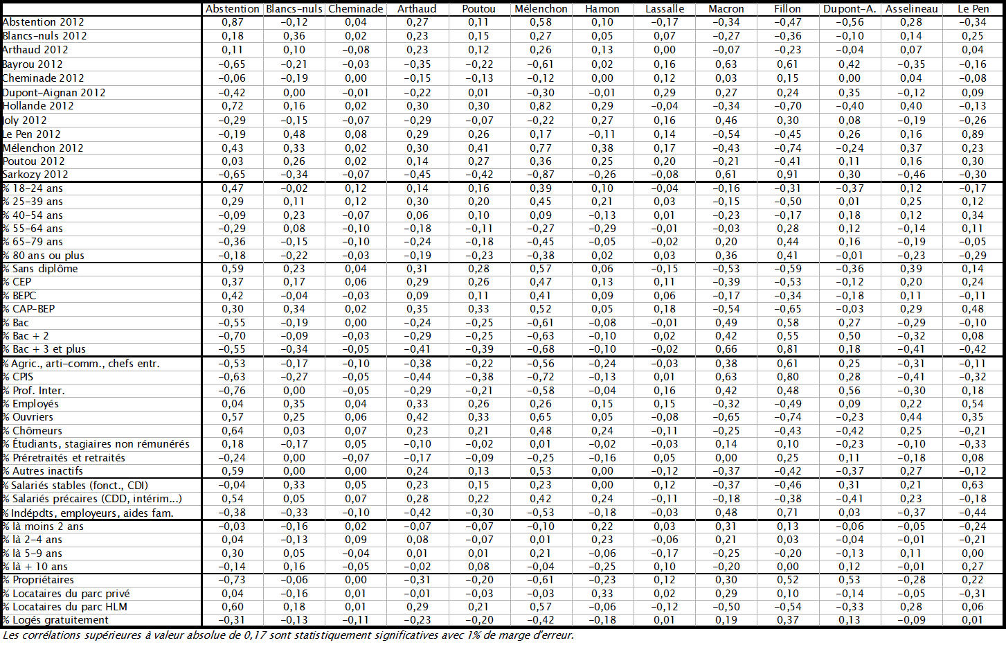 | Annexe 1. Quelques précisions méthodologiques Comme l’ensemble des articles de ce dossier thématique « Élection présidentielle : le vote des grandes villes françaises au microscope », les analyses proposées par les auteurs sont appuyées sur des cartes réalisées par Christophe Batardy (ingénieur d’études CNRS – UMR ESO) à l’échelle des bureaux de vote [7]. Les fonds de carte des bureaux de l’ensemble des villes au sommaire du dossier ont été produits grâce au travail d’actualisation de la base de données CARTELEC mené par Céline Colange (ingénieure de recherche CNRS – UMR IDEES). En complément de ces cartes, les auteurs ont pu mobiliser une matrice des corrélations statistiques (annexe 2) entre les comportements électoraux au premier tour du scrutin présidentiel de 2017, les votes observés au premier tour de la présidentielle de 2012 (de manière à pouvoir resituer politiquement les résultats), et quelques variables socioéconomiques diffusées par l’INSEE (de manière à pouvoir éclairer sociologiquement les résultats). Le problème d’inadéquation entre ces trois fonds de carte (découpage des bureaux en 2017, tracé des bureaux en 2012, périmètre des IRIS de l’INSEE en 2014) a été résolu par la ventilation de l’ensemble des données dans la maille spatiale des bureaux millésimés 2017, en s’inspirant de travaux développés dans le cadre de l’ANR CARTELEC (Beauguitte et Colange 2013) [8]. La production des matériaux cartographiques et statistiques a été coordonnée par Jean Rivière. Annexe 2. Matrice des corrélations |