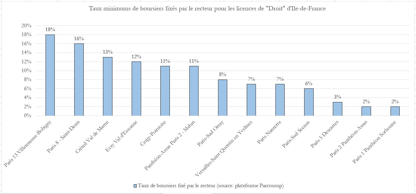 La mise en place d’un nombre minimum d’étudiants boursiers dans les établissements de l’enseignement supérieur, dont se targue la ministre, n’est que de la poudre aux yeux. En se contentant de 2 % de boursiers en licence de droit à Paris-1, tout en fixant un taux de 18 % à Paris-13 ou 16 % à Paris-8, le gouvernement ne fixe pas de cap ambitieux en matière de mixité sociale et territoriale. Ces effets sont renforcés par les modalités de la sectorisation et par l’obligation (Pech 2018), pour les universités parisiennes, de recruter une très faible part de candidats issus de banlieue.