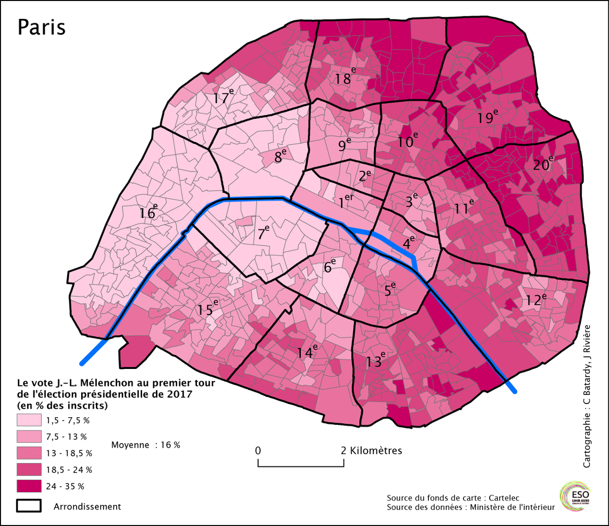 Carte 5. Le vote pour Jean-Luc Mélenchon à l’échelle des bureaux de vote parisiens