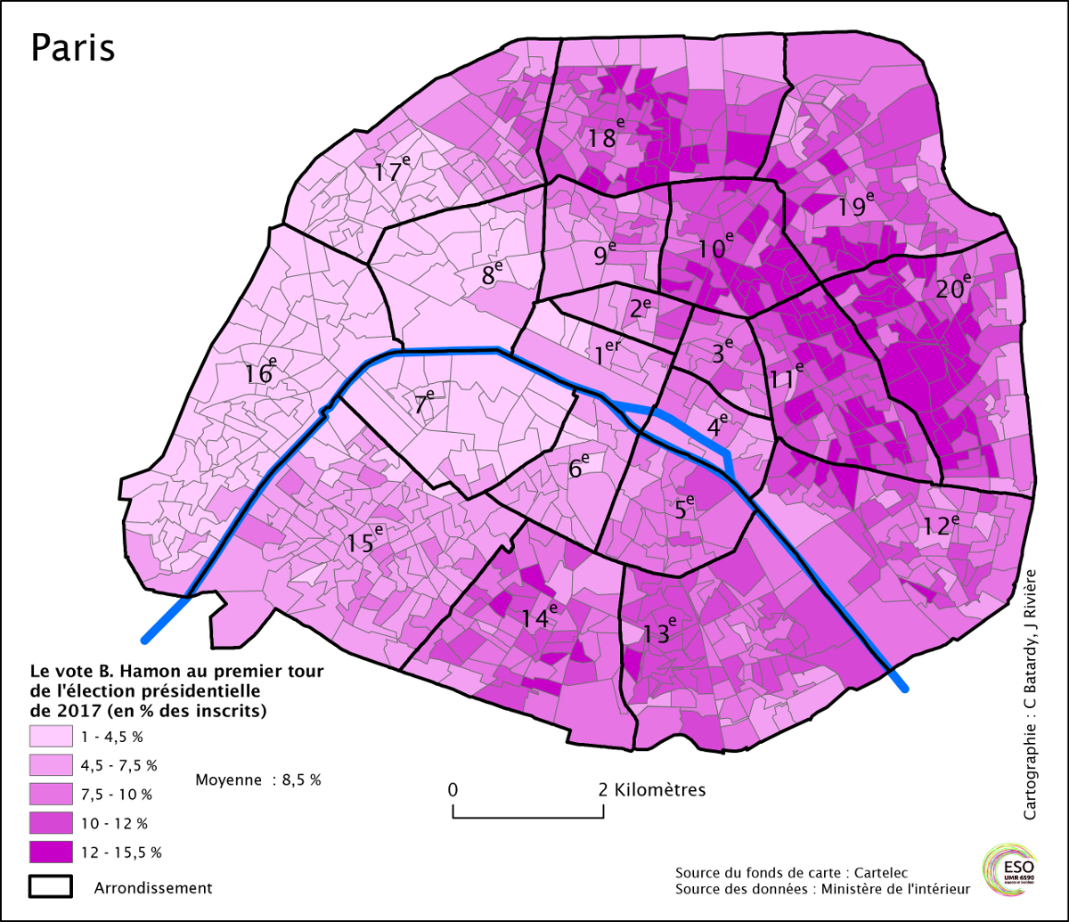 Carte 6. Le vote pour Benoît Hamon à l’échelle des bureaux de vote parisiens