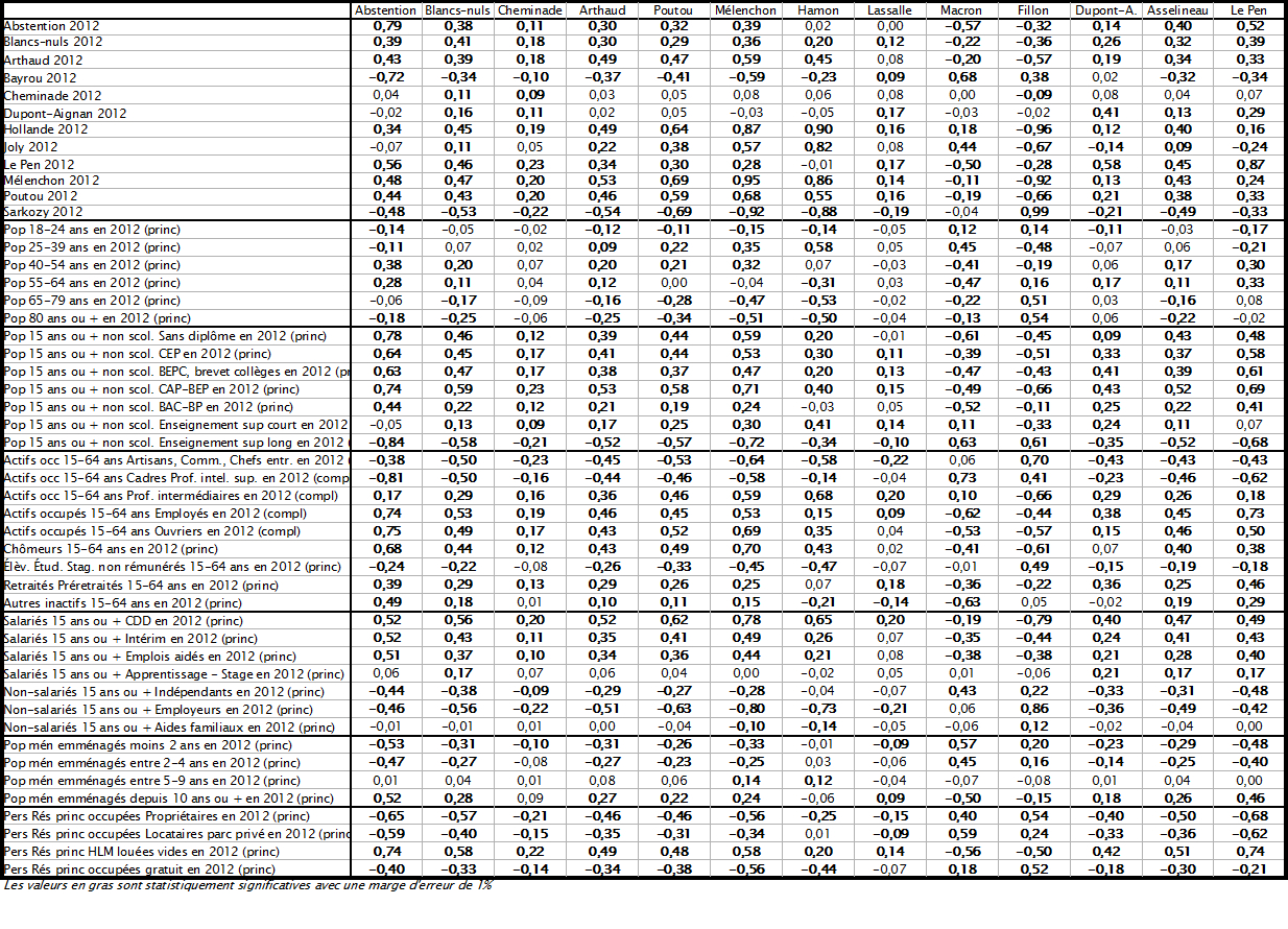Comme l’ensemble des articles de ce dossier thématique « Élection présidentielle : le vote des grandes villes françaises au microscope », les analyses proposées par les auteurs sont appuyées sur des cartes réalisées par Christophe Batardy (ingénieur d’études CNRS – UMR ESO) à l’échelle des bureaux de vote [2]. Les fonds de carte des bureaux de l’ensemble des villes au sommaire du dossier ont été produits grâce au travail d’actualisation de la base de données CARTELEC mené par Céline Colange (ingénieure de recherche CNRS – UMR IDEES). En complément de ces cartes, les auteurs ont pu mobiliser une matrice des corrélations statistiques (annexe 2) entre les comportements électoraux au premier tour du scrutin présidentiel de 2017, les votes observés au premier tour de la présidentielle de 2012 (de manière à pouvoir resituer politiquement les résultats), et quelques variables socioéconomiques diffusées par l’INSEE (de manière à pouvoir éclairer sociologiquement les résultats). Le problème d’inadéquation entre ces trois fonds de carte (découpage des bureaux en 2017, tracé des bureaux en 2012, périmètre des IRIS de l’INSEE en 2014) a été résolu par la ventilation de l’ensemble des données dans la maille spatiale des bureaux millésimés 2017, en s’inspirant de travaux développés dans le cadre de l’ANR CARTELEC (Beauguitte et Colange 2013) [3]. La production des matériaux cartographiques et statistiques a été coordonnée par Jean Rivière.