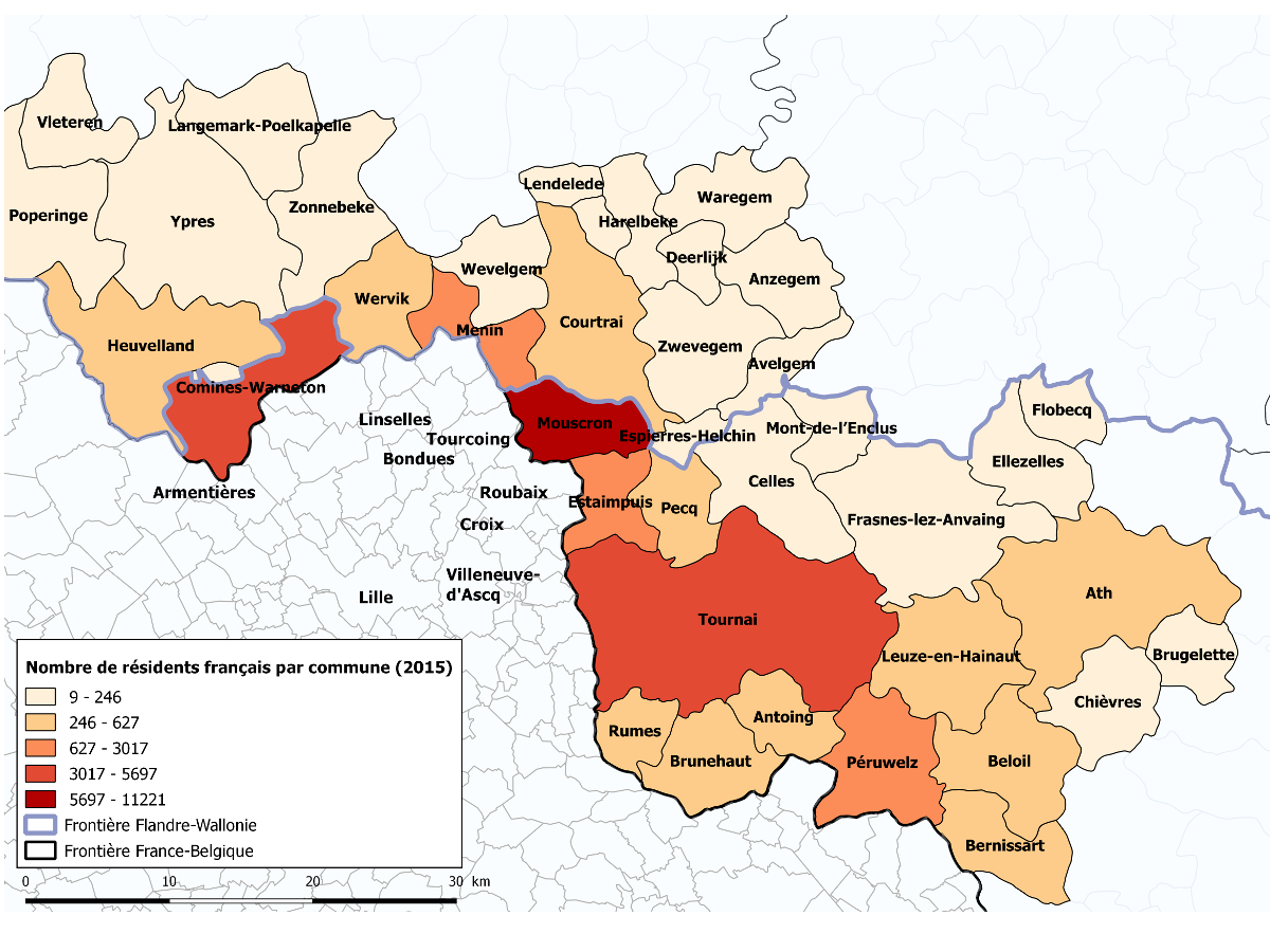 Cet article se penche sur des migrations moins connues, bien qu’elles s’intensifient depuis le début des années 2000 : celles de populations françaises quittant l’agglomération lilloise pour s’établir dans les communes belges du Hainaut et de Flandre occidentale, tout en conservant le plus souvent leur activité professionnelle en France [3]. Entre 2001 et 2016, la présence française dans les communes frontalières a très fortement augmenté, doublant presque à Mouscron et Estaimpuis, où elle représente désormais respectivement 20 % et 30 % de la population. Avec plus de 11 000 Français résidents, Mouscron accueille à elle seule 13 % des Français de Wallonie, et 7 % des Français de Belgique (figure 1). Ces chiffres masquent des réalités sociales contrastées. À l’est de l’agglomération lilloise, certains espaces ruraux abritent de grandes fortunes établies dans des villas ou d’anciens corps de ferme confortablement rénovés [4]. Les centres anciens de Comines-Warneton et Mouscron, caractérisés par la prégnance de l’habitat ouvrier hérité du développement de l’industrie textile, accueillent pour leur part des populations françaises appartenant aux classes moyennes. C’est à ces dernières que s’intéresse notre enquête.