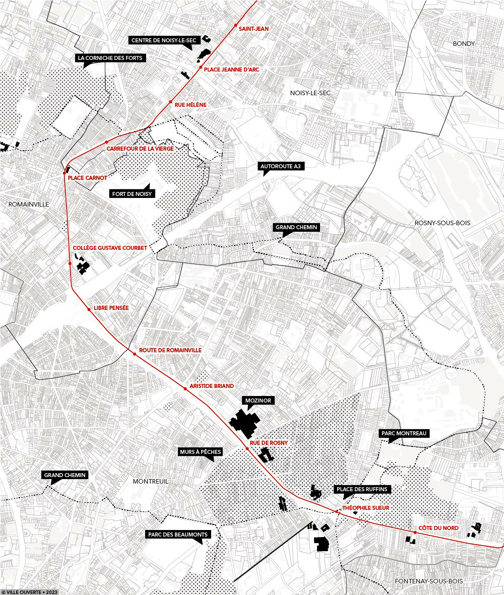 Ce prolongement du réseau ferré est spectaculaire à plusieurs titres. Avec le coteau du plateau d’Avron entre Noisy-le-Sec et Romainville et la « côte du Nord » à Montreuil, il franchit une topographie contraignante. Ces deux ascensions constituent des prouesses techniques, d’autant qu’elles doivent se frayer un chemin dans des tissus urbains existants, à travers des rues peu larges. Par ailleurs, un nouveau pont reconfigure le franchissement de l’autoroute A3 dont la construction, à partir de 1969, est venue sectionner des parties de villes. Le tramway traversera également les Murs à pêches [1] et reliera plusieurs grands parcs rassemblés autour du Grand Chemin [2]. Indubitablement, ce tracé donnera une adresse et une visibilité nouvelle aux grands éléments paysagers de l’Est parisien.