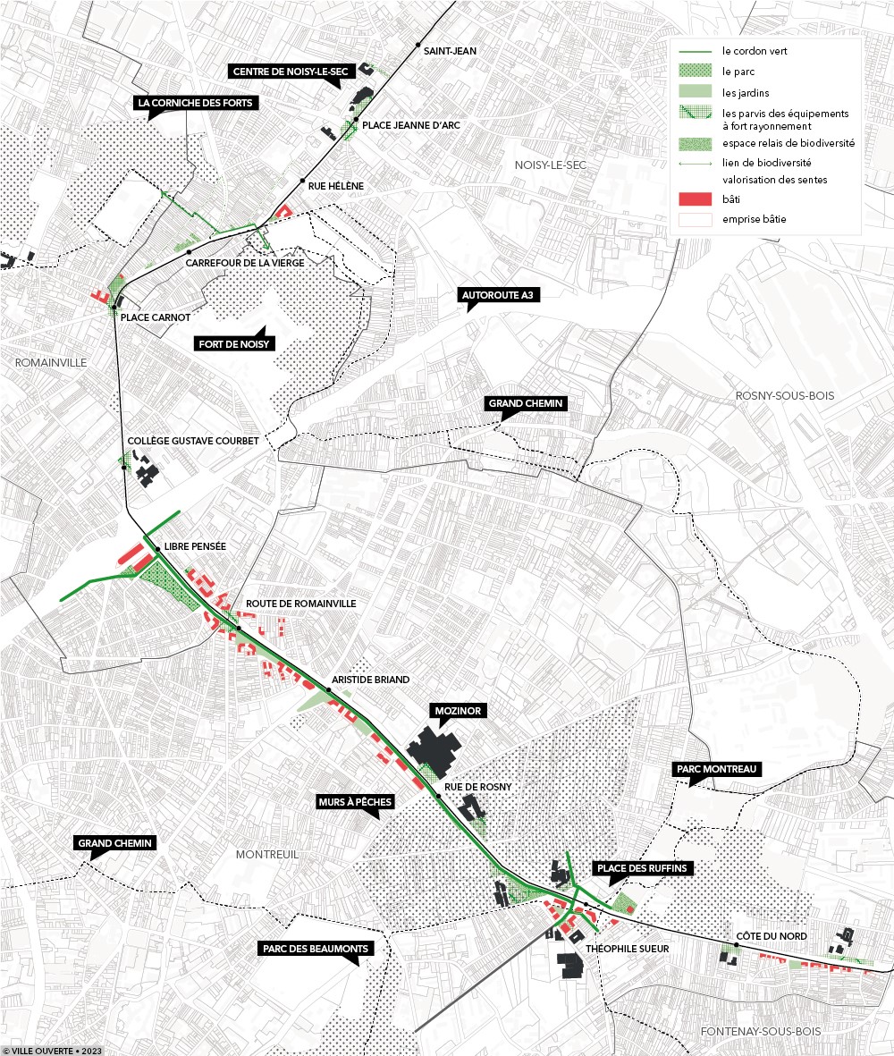 Une nouvelle géographie et des nouvelles pratiques urbaines se construisent. Dans cette magistrale recomposition, le passage du tramway ouvre une question d’urbanisme : comment faire muter la ville autour de ce nouvel équipement de transport ? Comment et à quelles fins mobiliser le foncier dont la valeur est considérablement renchérie par la desserte nouvelle ? Quel paysage composer et présenter à des usagers habitués à une ville fragmentée, ayant trop longtemps subi l’absence de continuité et de confort de l’espace public ? Ville Ouverte [3] travaille depuis 2021 aux côtés des paysagistes Coloco, des écologues d’Urban-éco, des experts en programmation économique Créaspace et des experts en mobilité RRA, pour établir le plan-guide des abords du tramway T1 sur les communes de Noisy-le-Sec, Romainville et Montreuil. Dès le stade de l’appel d’offres, nous appelions à « planter d’abord, bâtir parfois ». Il nous apparaissait en effet que dans un territoire postindustriel, marqué par les infrastructures, on ne pouvait procéder en urbanisme comme à l’habitude. Malgré les défis du bilan d’opération [4], il fallait s’imposer comme méthode de dessiner avant tout la trame végétale, la continuité des cheminements et des liens. Pour ce plan-guide, nous avons d’abord choisi les lieux à sanctuariser pour la plantation avant d’identifier les fonciers constructibles : les espaces verts ne sont plus considérés comme la résultante des surfaces constructibles, mais comme la trame majeure au sein de laquelle le bâti s’insère – lorsque cela est opportun.