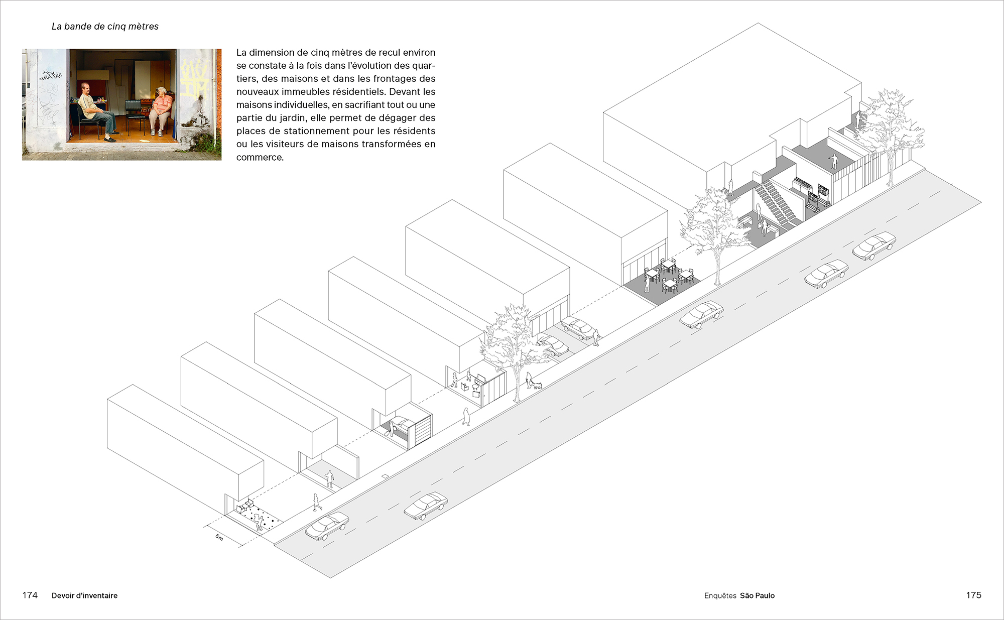 Dans la partie « Droit d’inventer », qui compose une part importante de l’ouvrage (p. 61-312), les auteurs étudient finement le fonctionnement de rez-de-ville singuliers en portant une attention particulière au frontage, zone mi-privée mi-publique entre l’immeuble et la rue. Des monographies portant sur des grandes villes aussi diverses qu’Ahmadabad (Inde), Beyrouth (Liban), Rabat (Maroc), Kinshasa (Congo), São Paulo (Brésil), Brasilia (Brésil), Singapour et le Grand Paris sont présentées sur la base d’un protocole commun d’analyse. Ces enquêtes, richement illustrées, montrent une diversité de manières de gérer ce rez-de-ville, par un urbanisme réglementé comme dans des formes d’urbanisation informelle. Par exemple, les oatla indiens (figures 1 et 2), ou encore la bande de cinq mètres entre la résidence et l’espace public du trottoir dans le quartier Hygienopolis à São Paulo (figures 3 et 4), pour ne citer que ces derniers, illustrent la flexibilité et la diversité d’usages auxquels peut donner lieu ce seuil actif.