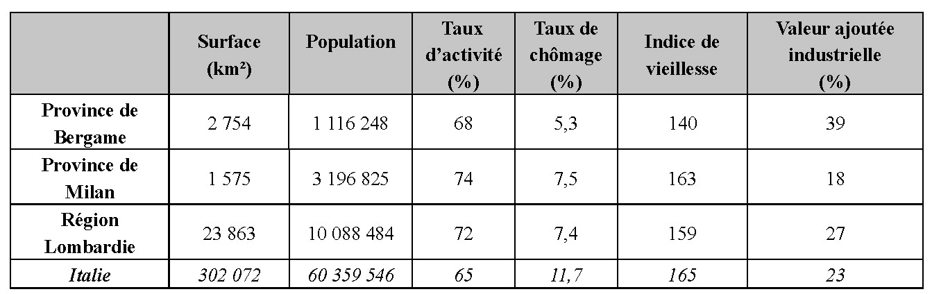 Située au cœur de la Lombardie, région la plus riche et la plus urbanisée d’Italie (et l’une des plus riches d’Europe), à cinquante kilomètres au nord-est de Milan, la province de Bergame rassemble en 2020 un peu plus d’un million d’habitants (dont 120 000 seulement dans la ville-centre). Elle est marquée par une situation d’entre-deux territorial : ce n’est ni une métropole ni une simple ville moyenne environnée d’un pays rural ; ce n’est ni une centralité ni une périphérie marginale ; son économie prospère est fortement industrielle, à la fois ancrée localement et insérée dans les réseaux économiques mondiaux.