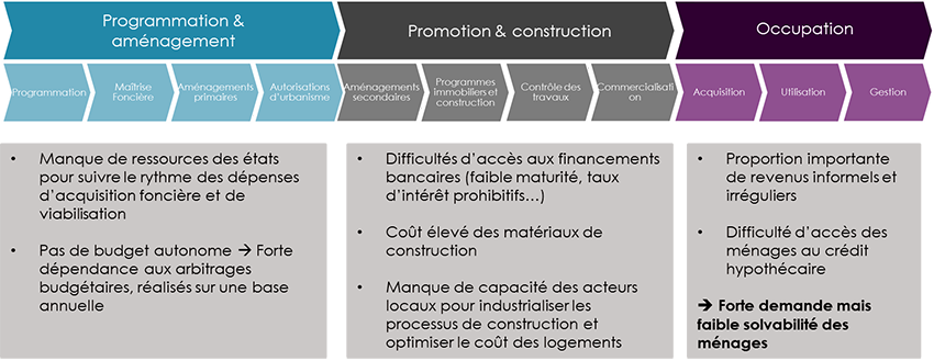 - firstly, financial difficulties: the difficulty for governments to finance the acquisition and servicing of land due to a lack of resources, [5] difficulty for developers to borrow on acceptable terms on the markets, but also difficulty for households to take out loans despite the support measures put in place, due to low or informal incomes;
