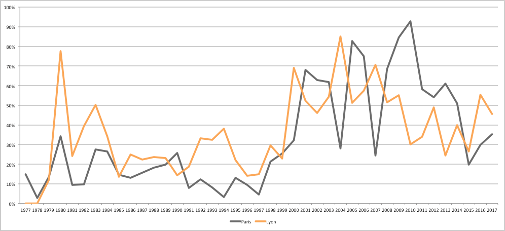 Globalement, les courbes des acquisitions (figure 4) par les bailleurs sociaux à Paris et à Lyon ont le même profil avec des amplitudes plus fortes à Lyon au début des années 1980 et en 1992-1995 et à Paris durant les années 2008-2014. Elles traduisent des conjonctures locales propres définies par les opportunités d’achat d’immeubles collectifs anciens. La loi SRU couplée avec la suppression de l’obligation de rénovation (2001) va dynamiser ces acquisitions.