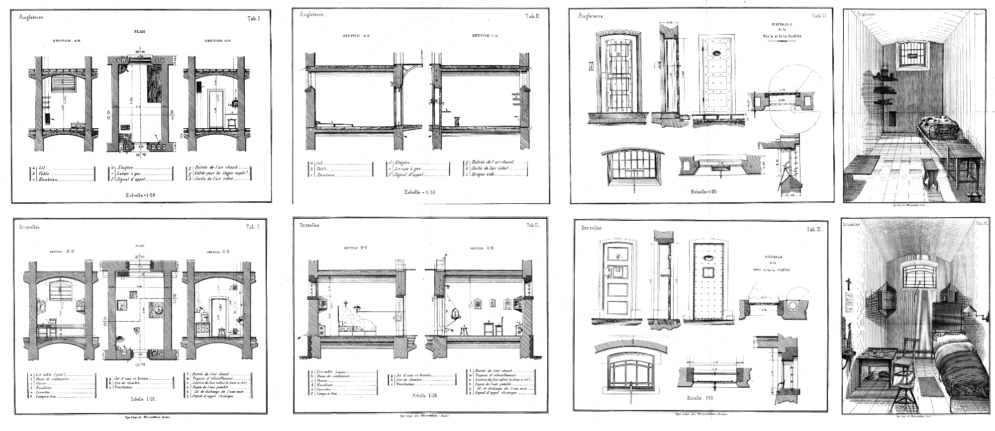 Les congrès pénitentiaires internationaux travaillent à rendre plus précises certaines dispositions spatiales, mais laissent flous nombre des lieux nécessaires au fonctionnement de la prison. Si la cellule est dûment mesurée, dessinée dans ses moindres détails et similaire d’un pays à l’autre, si la place de la chapelle et ses dispositions cellulaires sont vivement débattues par des acteurs convaincus d’une rédemption possible des délinquants et des criminels par la religion, sont laissés dans l’ombre aussi bien les espaces de circulations et de travail, que les espaces administratifs et techniques.