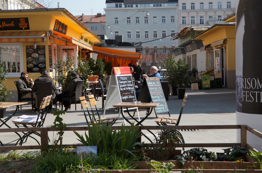 La balade a un point de départ. Elle commence dans une rue, dans une place ou alors dans une boutique ou dans un salon marocain. Tout au long de l’exposition, nous découvrons des formes ordinaires d’entraide, d’hospitalité et de plaisir dans des cafés, restaurants rapides, commerces bon marché, marchés, associations, jardins ouvriers, squares, cafés sociaux et lieux de culte qui sont riches en échanges humains. Les lieux de culte sont tantôt présentés comme étant inhérents au quotidien (église catholique de Bruxelles), tantôt pointés comme preuve d’un « esprit de lieu pluraliste » (l’église protestante de Vienne), tantôt comme lieu de résolution des tensions locales avec la municipalité (la salle de prière associée au projet cultuel de l’Institut des cultures d’islam à Paris) [3]. C’est en revanche une ancienne pizzeria anarchiste (quartier de Volkert, Vienne), qui semble incarner davantage la violence incomprise, à la suite des interventions policières qui ont mis fin à cette expérience de convivialité. Souvent situés à proximité de lieux de circulation importants (gares et aussi arrêts de tram et stations de métro), ces quartiers sont mis en images de manière à évoquer la gentrification et ses rénovations, mais également des initiatives permettant de faire face à la pauvreté, à la dégradation des conditions d’emploi, de logement et de certains espaces publics. À pied comme à vélo, différents groupes d’âge (même si les personnes âgées sont quasi inexistantes) et milieux sociaux se côtoient sans pour autant se rencontrer toujours, comme c’est notamment le cas dans la Volkertplatz à Vienne.