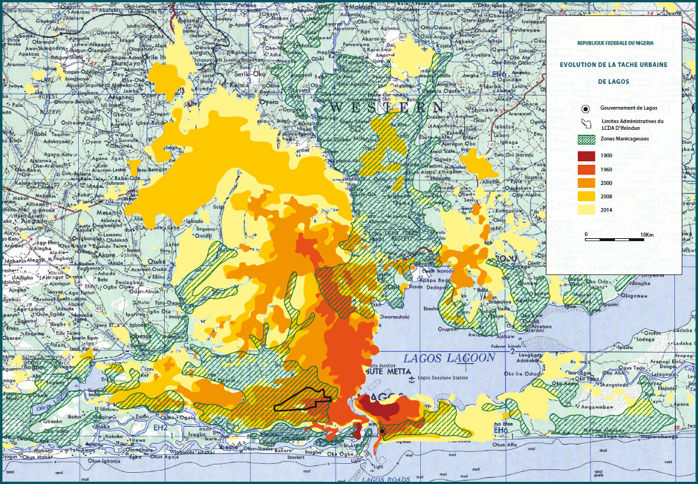 Lagos présente deux visages, fort contrastés. D’un côté, « Lagos la mégalo » (Bouillon 2014), le poumon économique du plus gros PIB d’Afrique, la métropole de la croissance où tout est possible, celle de la classe moyenne en plein essor, de l’énergie créative où une nouvelle génération de jeunes entrepreneurs formée à l’étranger entend bien contribuer au dynamisme et à l’essor économique du pays. En 2013, Lagos comptait près de 10 000 millionnaires. D’un autre côté, Lagos et ses slums [1] sous- et mal équipés, construits pour la plupart sur des marécages, rassemblant plus de 12 millions d’habitants. Ces zones humides représentent 78 % de la surface de l’État de Lagos. Bien que souvent inconstructibles, elles sont très densément peuplées, comptant en général plus de 1 200 habitants à l’hectare. La première des priorités est la mise en place d’un système efficace de drainage, sans lequel aucun développement n’est possible. Celui-ci est rendu d’autant plus difficile par l’absence d’espaces disponibles.