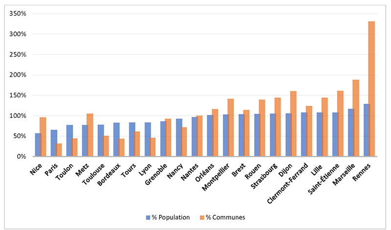 Lorsque le % dépasse 100, la population ou le nombre de communes de la métropole déborde l’aire urbaine.