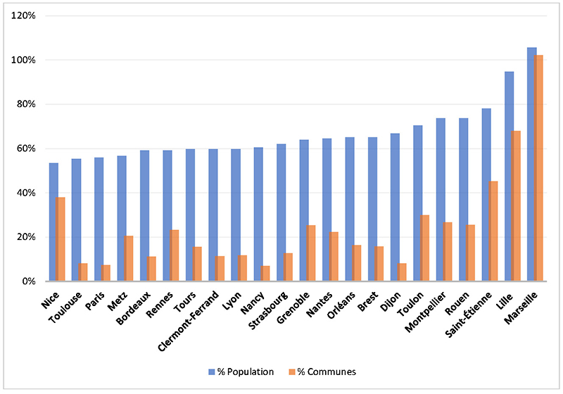 Lorsque le % dépasse 100, la population ou bien le nombre de communes qui composent la métropole excèdent les limites du périmètre de l’unité urbaine, c’est-à-dire des communes urbaines contiguës.