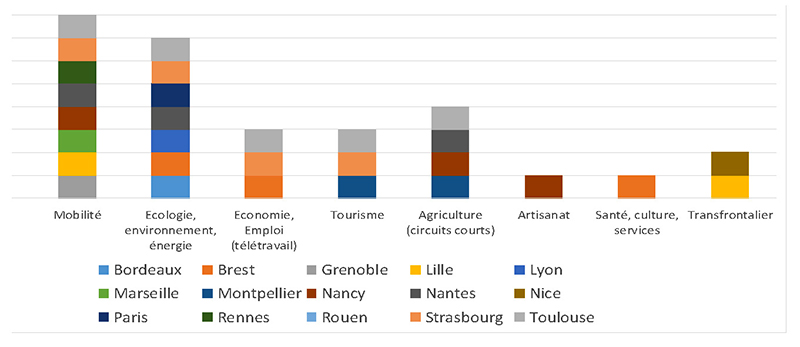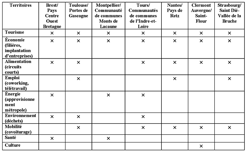 Les coopérations peuvent être monothématiques mais comprennent le plus souvent deux, voire trois thématiques. Celles-ci concernent en général la gestion des mobilités, les questions énergétiques, devant les thèmes économiques (et plus précisément le tourisme), l’agriculture (circuits courts) ou l’artisanat. Le rayonnement économique métropolitain à l’égard des territoires extérieurs est mentionné par au moins trois métropoles, et le télétravail par quelques autres.