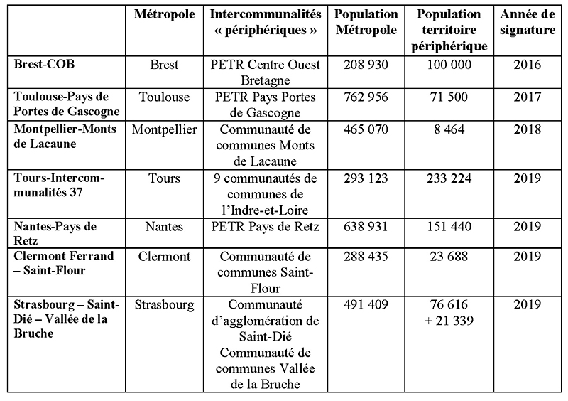 À l’automne 2019, sept métropoles avaient signé un contrat de réciprocité : Brest et le PETR (pôle d’équilibre territorial et rural) Pays du Centre-Ouest Bretagne (2016), Toulouse et le PETR Pays Portes de Gascogne (2017), Montpellier et la communauté de communes des Monts de Lacaune et de la Montagne du Haut-Languedoc (2018), et en 2019 : Tours et les intercommunalités d’Indre-et-Loire ; Nantes et le PETR Pays de Retz ; Clermont–Auvergne et la communauté de communes de Saint-Flour ; et Strasbourg, la communauté d’agglomération de Saint-Dié et la communauté de communes de la Vallée de la Bruche. Trois contrats ont été signés avec des PETR et les autres avec des EPCI à fiscalité propre (communautés de communes et d’agglomération).