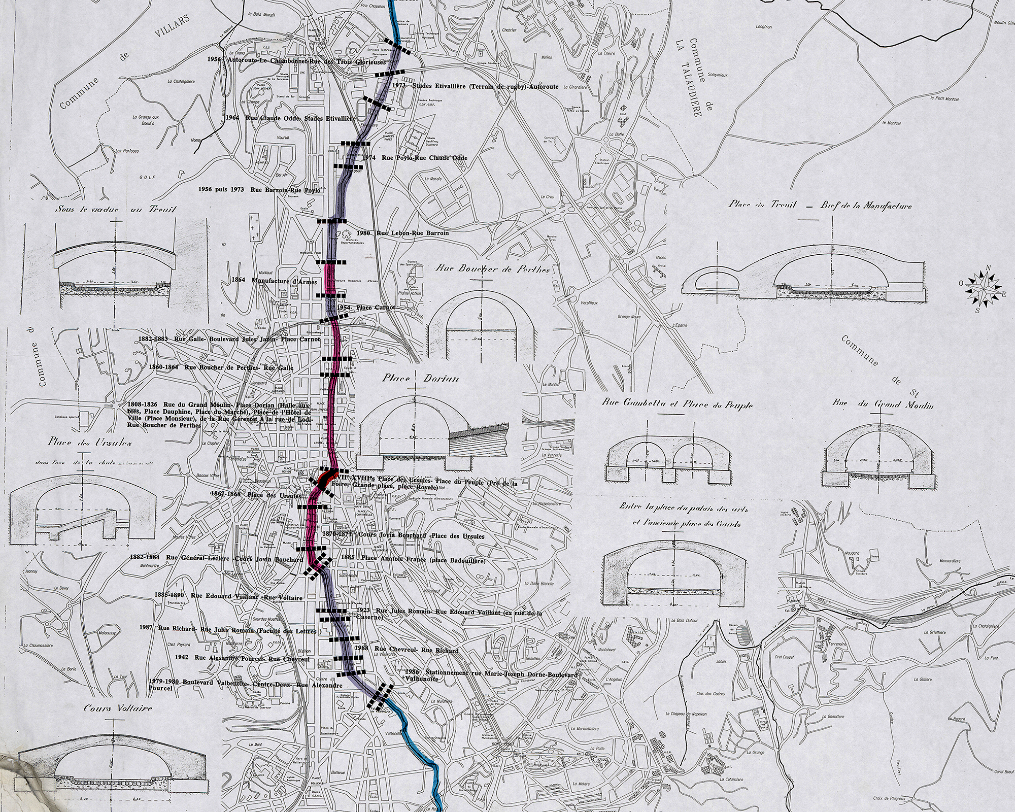 Source : Stéphanoise des Eaux. Réseau hydrographique de la ville de Saint-Étienne, 1990. Archives municipales de Saint-Étienne : 1FI, Furan, 11 – Sur les traces du Furan…, p. 163.