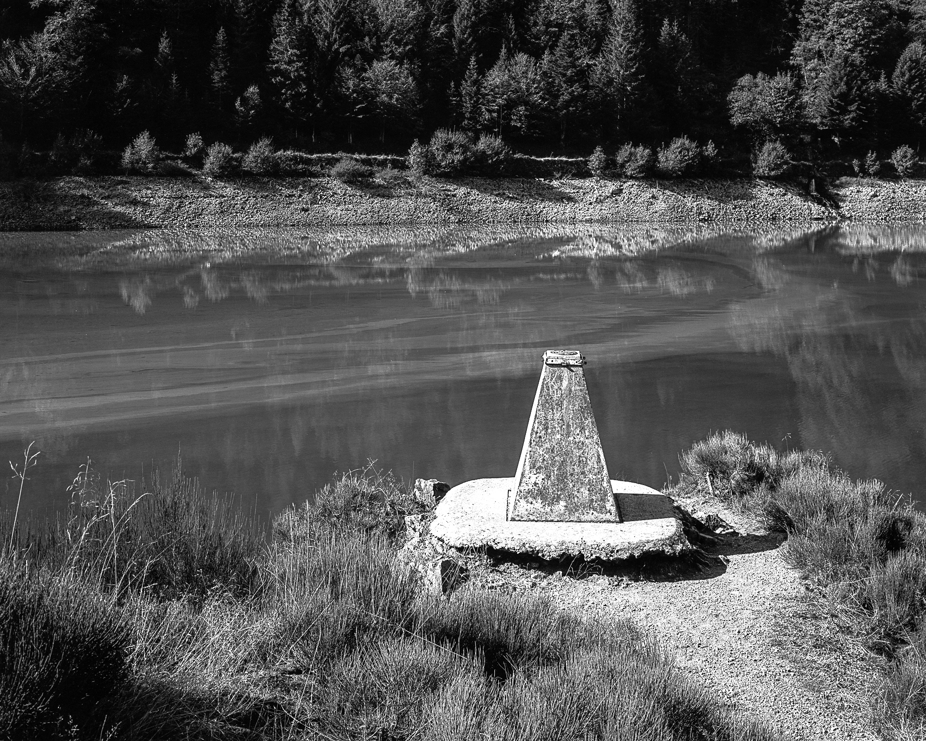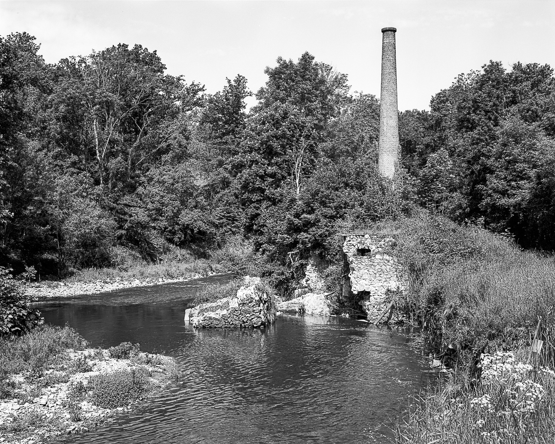 Ces photographies représentent la rivière de sa source dans les monts du Pilat à sa confluence avec la Loire, les sites s’enchaînant en un long travelling au sein de l’ouvrage, comme ils le font géographiquement sur le terrain. Pierre Suchet a mené ce travail pendant plus de dix-huit mois, préparant ses séances de prises de vues à partir d’une documentation [cartographique>1544] et d’archives visuelles anciennes [1]. La série de photographies représente des sous-bois montagneux, des ouvrages d’ingénierie hydroélectrique du XIXe siècle, des espaces urbains (sous lesquels coule la rivière), des zones périphériques où se côtoient bords de route, industries, habitations, pour finir par une morphologie plus naturelle aux abords de la Loire. Les clichés redonnent ainsi à voir un cours d’eau relégué et effacé du paysage, le photographe ayant construit ses points de vue en trouvant malgré tout des accès aux berges pour y installer son trépied. L’usage de la chambre entraîne une finesse de restitution des ambiances lumineuses, valorisant les qualités de réflexion des matières (arbres, murs, chaussée, etc.), servant la perception des détails.