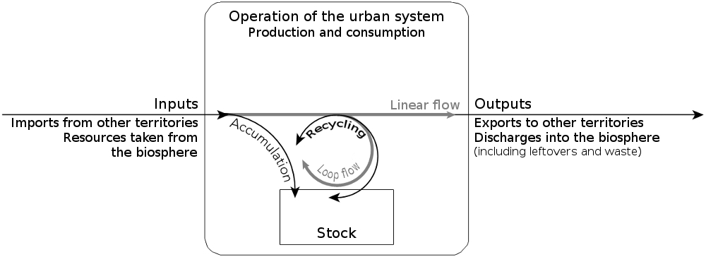 The origins of the waste crisis have already been attributed to fatality or the result of a failure of public action to address the imperatives of the Camorra (Giuliani 2009). By situating it in the long history of the city, the author explains its socio-ecological foundations. The book studies waste production and management in Naples between 1884 and 2004 based on the notion of urban metabolism, which makes it possible to examine the relationships between the urban site, society and its physical environment. The analysis of the flow of materials into and out of the city defines this metabolism. Naples, like any other urban site, has an initial material stock that is insufficient for the sustainability of the human settlement. To compensate for this, this territory takes and imports materials from the biosphere or other territories, as well as rejects and exports these materials (or others) to third spaces (Barles 2007). The result is a more or less looped cycle operation, depending on whether the incoming flows are recycled within the urban system or, on the contrary, exported (see Figure 1).