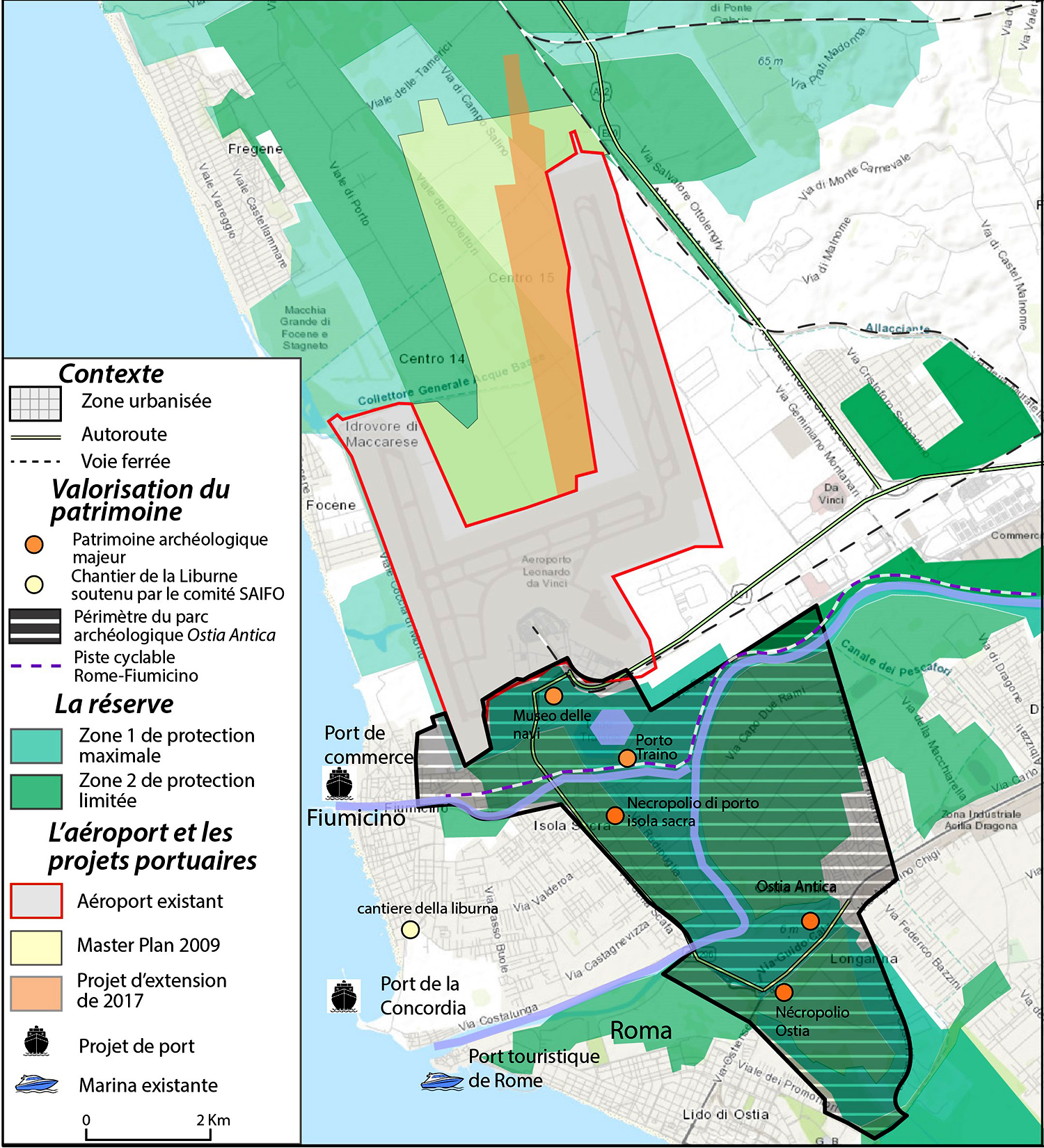 Ce déploiement très inégal des opportunités d’extraction de la rente urbaine et touristique sur le territoire renvoie d’abord à des causes générales, comme l’hyper-hiérarchisation de l’économie touristique globalisée. Il faut y ajouter le caractère déstructuré d’une croissance urbaine qui s’est opérée sur la base d’un vide préalable, celui du « désert romain » transformé par les bonifications rurales des années 1880 et du fascisme. Fiumicino, avec son modèle urbain éclaté, appuyé sur les échangeurs, les gares ou les opportunités foncières est un archétype de « ville incomplète », une périphérie logistique au service de la métropole, dont les grands équipements contrastent avec l’absence criante de voies de communication adaptées à l’échelle locale (Delpirou et Rivière 2013). Certes, les ressources patrimoniales et ce qui reste des aménités paysagères sont en théorie protégés (Fig. 2). Le périmètre le plus protecteur dans l’absolu est celui du Parc archéologique. Plus large, la Réserve naturelle du littoral romain date de 1996, mais elle n’a vu son plan adopté qu’en 2019. Alors même que, comme le note le Plan de la réserve, cette banlieue en perpétuel chantier présente « un système […] qui souffre de “schizophrénie” dans ses dynamiques de lecture et d’exploitation [4] », de nouveaux grands projets d’infrastructures sont en cours sur ses franges, comme celui du port de croisière de la Concordia, dont les travaux de déblaiement ont commencé sur fond de contestations locales [5].
