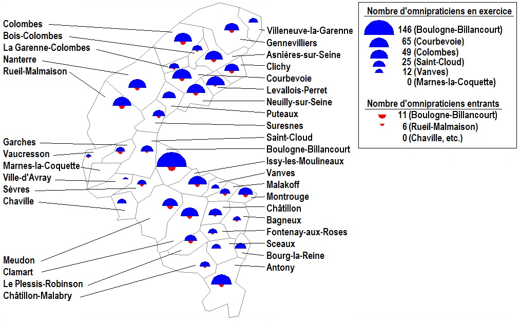 Malgré la forte densité médicale des Hauts-de-Seine, l’hypothèse initiale de rationalité des médecins semble plausible. Le département attirerait les nouveaux omnipraticiens pour son contexte économique et les conditions de vie qu’il propose. Pour les jeunes installés, une stratégie concurrentielle d’installation envisageable consisterait, dans ce cadre, à capter dans un premier temps des revenus forfaitaires en privilégiant les patientèles en ALD puis à construire leur patientèle en fonction d’inclinations plus personnelles comme le secteur tarifaire, le sexe, le mode d’exercice ou la commune. Ainsi, en superposant des revenus forfaitaires à la tarification à l’acte, la politique économique de santé introduirait une priorité d’ordre économique dans la constitution de la patientèle.