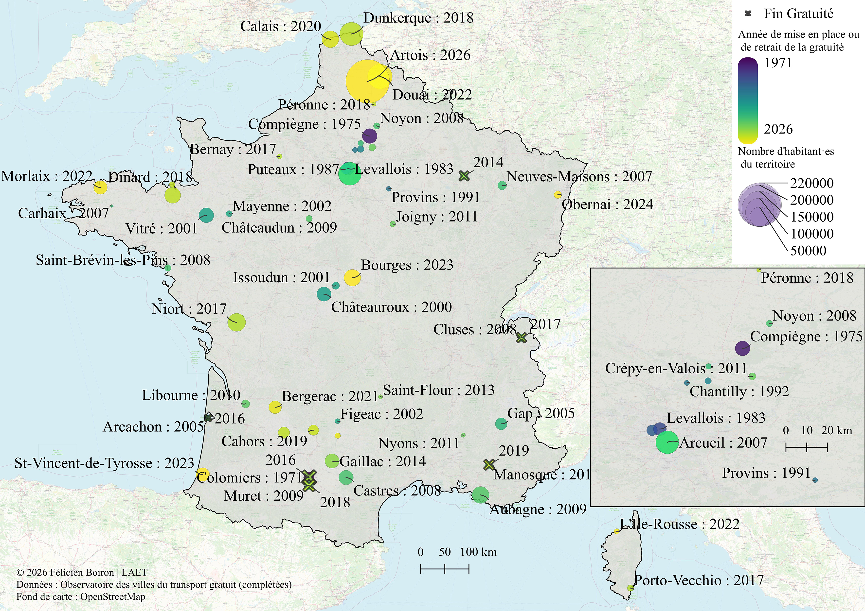 Malgré ce contexte institutionnel et sectoriel largement défavorable, la gratuité totale des transports se développe (figure 1). Longtemps limitée à quelques petites villes, elle s’étend depuis les années 2000 vers les territoires les plus urbanisés, qui sont ceux où l’opposition à la mesure est la plus manifeste. Après Aubagne en 2009 (100 000 habitant·es) et Dunkerque en 2018 (200 000), les transports en commun deviennent gratuits pour les résident·es de la Métropole de Montpellier en 2023, ce qui en fait le premier réseau français gratuit comprenant plusieurs lignes de tram. Début 2026, le syndicat de l’Artois est devenu à son tour gratuit sur un territoire de plus de 650 000 habitant·es.