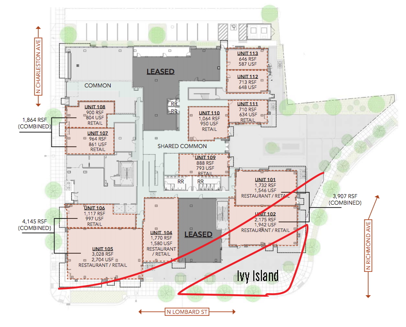 This realignment referenced the “preferred option” out of three proposed in the SJLP (see Figure 1). The intention was for this corner plaza to create a new gateway that would replace Ivy Island, while maintaining roughly the same amount of public space. However, in addition to the public plaza on the corner, the new design also extended the footprint of the building well into what was currently public right-of way, which was a departure from the SJLP’s recommendation. Since it was a project by a private developer, there was no public design input opportunity or process (Lynsky 2017).