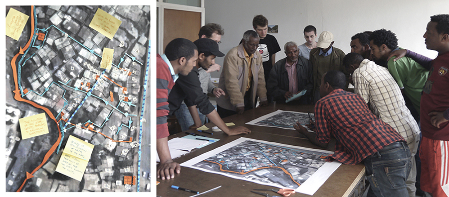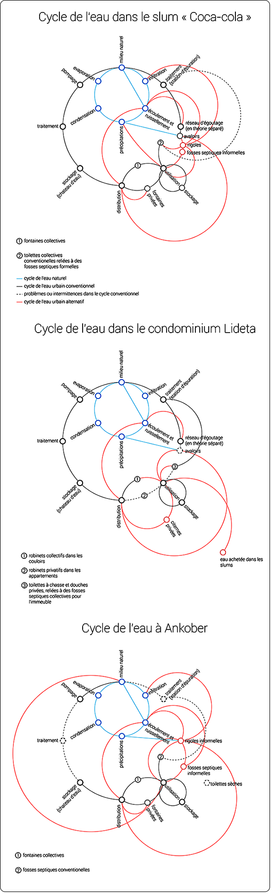 L’Éthiopie est l’un des pays au monde avec le plus grand nombre d’habitants n’ayant pas accès à l’eau potable (UN-Habitat 2017). L’accès aux services urbains de base y est encore inégal du fait de l’urbanisation informelle, de la faible capacité institutionnelle et économique des autorités locales, d’une application partielle des politiques publiques et de la disparité des situations sociales (Dill et Crow 2014). Cela se traduit par un accès inéquitable au réseau conventionnel [1]. Par conséquent, les habitants ont localement recours à des stratégies et des dispositifs que nous qualifions ici « d’alternatifs ». Ces pratiques alternatives nécessitent peu ou pas d’infrastructures, sont souvent faciles à entretenir et à remplacer et sont généralement informelles (Allen et al. 2017). La littérature scientifique porte essentiellement sur la coexistence de différents types de réseaux de distribution et d’accès aux services d’eau (conventionnels et alternatifs, formels et informels, centralisés et décentralisés) ainsi que sur les avantages et inconvénients de chacun (Domènech 2010). Nous nous intéressons ici à la matérialité des interactions entre ces différents réseaux. Nous avons procédé par études de cas en sélectionnant trois tissus urbains caractéristiques des formes que prend le développement urbain actuel en Éthiopie : un slum situé à Addis-Abeba, appelé « Coca-Cola » du fait de sa proximité avec une usine de la compagnie, le condominium Lideta, situé dans le centre ouest de la capitale et Ankober, une petite ville située à 170 km de la capitale, faisant l’objet d’un projet de développement gouvernemental (figure 1). Dans quelle mesure ces différentes formes d’urbanisation conditionnent-elles l’accès au réseau conventionnel d’eau potable et l’émergence de dispositifs alternatifs ? Pour répondre à cette question, nous avons effectué un travail de relevés mêlant documentation, cartographies participatives, observations in situ, questionnaires et interviews semi-structurées (figure 2).