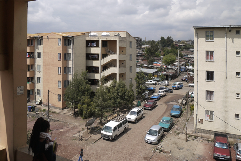 Depuis les années 2000, le gouvernement éthiopien a lancé une politique de développement urbain visant à permettre un meilleur accès aux logements et aux infrastructures. À Addis-Abeba, outre la rénovation de certains slums et le réaménagement urbain du centre-ville, ce programme se focalise sur la construction de logements subventionnés, les condominiums [2]. Les condominiums sont construits dans des espaces ouverts à la périphérie de la ville ou dans la ville suite à la destruction de slums et au relogement de leurs habitants (UN-Habitat 2017). À Lideta, il existe deux types de condominiums, desservis en eau potable par un système conventionnel aménagé dès la construction des immeubles (figure 4). Les appartements du premier type sont directement desservis par des conduites secondaires individuelles et n’ont souvent pas d’eau au-delà du troisième étage, faute de pression. Dans le second type, les conduites secondaires mènent à une citerne posée sur le toit qui redistribue l’eau aux appartements. Faute de pression, là aussi, celle-ci est souvent vide.