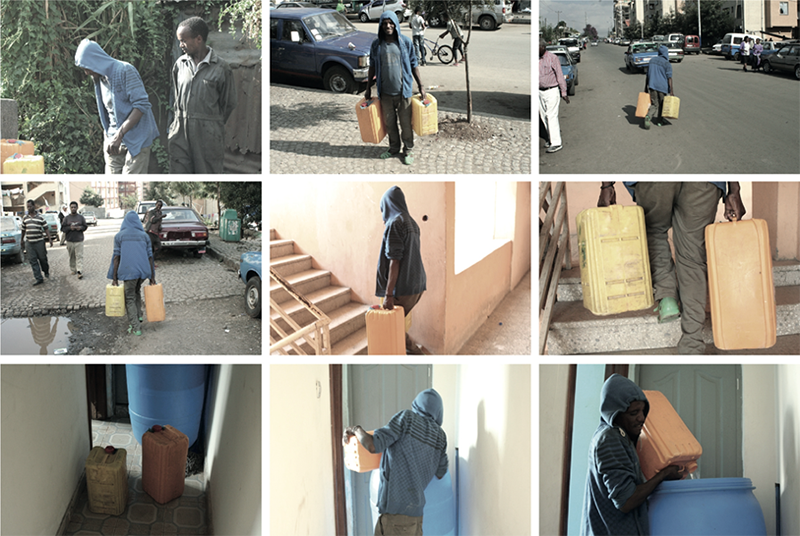 L’AAWSA a reçu de nombreuses requêtes demandant de régler les problèmes des habitants des deux types de condominiums. Face à l’impossibilité d’augmenter en continu la pression de l’eau sur l’ensemble du système, l’AAWSA a proposé l’installation de pompes au niveau du raccordement des condominiums aux réseaux de distribution. Néanmoins, cela n’est possible que si l’ensemble des propriétaires s’accordent et interviennent financièrement. Cela n’a pas été le cas dans les condominiums étudiés. Les habitants des deux types de condominiums ont donc mis en place plusieurs stratégies pour pallier les insuffisances du système conventionnel, qui coexistent souvent au sein d’un même bâtiment. Pour les habitants propriétaires, nettement minoritaires, l’une de ces stratégies consiste à installer un réservoir privé avec pompe de surpression dans les espaces communs où sont situées les conduites d’eau. De tels dispositifs individuels peuvent assurer un approvisionnement continu en eau, mais du fait de leur prix élevé, seuls les habitants propriétaires sont prêts à faire ce type de dépenses. De plus, la pose de ce réservoir privé nécessite une autorisation du comité de copropriété. Aucun habitant locataire rencontré ne bénéficiait de ce type de dispositif. Souvent, les habitants locataires n’ont d’autre possibilité que de stocker leur eau dans des barils, des jerricans et des bidons qui occupent une grande partie de la surface de leur logement et ne sont remplis que lorsque la pression est suffisante (par intermittence et la nuit pour les habitants des étages supérieurs). Les habitants qui n’ont plus d’eau doivent en acheter dans un slum situé à côté du condominium ou aux habitants des étages inférieurs qui possèdent des robinets directement branchés sur les conduites secondaires dans les couloirs (figure 5).