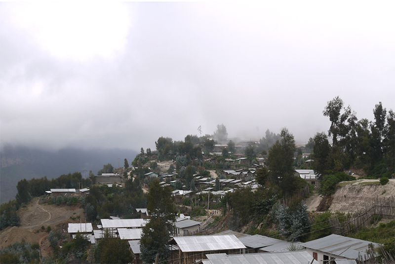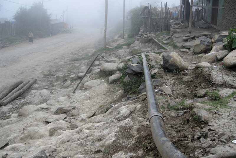 Ankober est une petite ville éthiopienne, chef-lieu d’un wereda situé dans la région Amhara, à la limite du plateau éthiopien. Autrefois centre politique et commercial important, la ville a connu une période de déclin suivie d’un renouveau et d’une forte augmentation démographique depuis plusieurs années. Ankober est composée d’habitations traditionnelles basses et de quelques immeubles situés le long de la route principale (figure 6). La fourniture en eau de la ville a longtemps dépendu de sources naturelles, principalement alimentées par les précipitations. L’eau des sources est aujourd’hui captée par un système centralisé [3]. Dans les années 2000, une première infrastructure conventionnelle de distribution d’eau a été installée, comprenant réservoirs et conduites vers des fontaines publiques ou des robinets privés. Depuis cette période, avec l’augmentation de la population d’Ankober et les changements dans les modes de vie, la demande s’est fortement accrue et le système a été saturé. Ce premier réseau a été complété par une seconde infrastructure conventionnelle qui ne couvre cependant toujours pas l’ensemble de la ville et n’a qu’une faible capacité de stockage. Cette seconde infrastructure a été construite de manière anarchique, au fur et à mesure des demandes des habitants (figure 7).