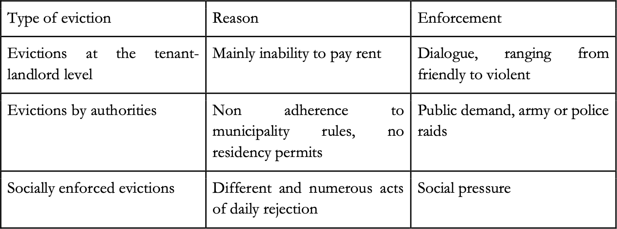 Refugees tend to take the initiative to leave their shelter when they cannot pay. This is a preventive measure to avoid eviction that is enforced by varying degrees of violence, from a request to move out, to a threat of police intervention; and varying degrees of authority, ranging from the landlord to the neighbors to the local authorities. Figure 3 shows three types of evictions observed during fieldwork.