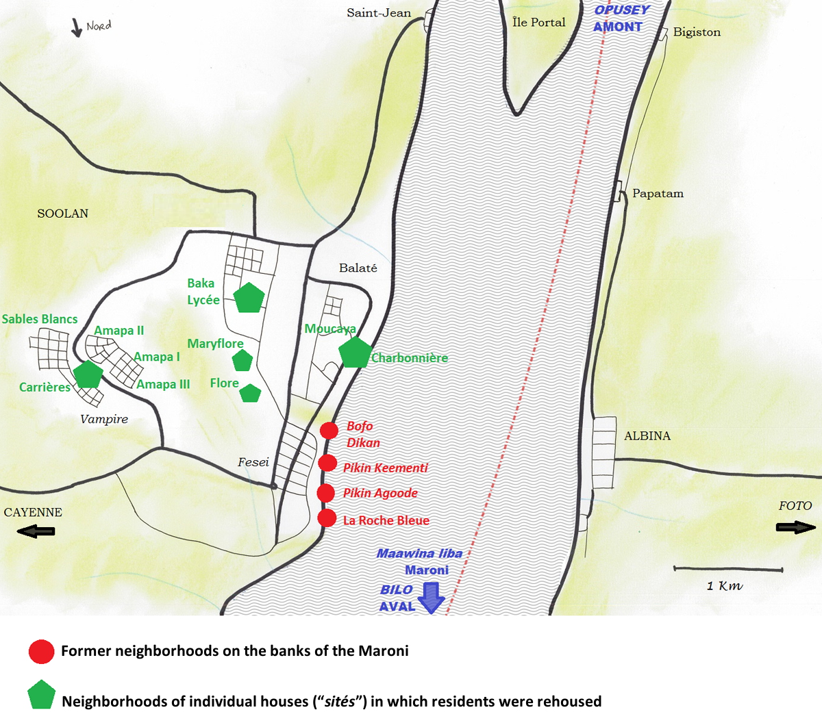 The colonial legacy of these policies can be seen not only in the considerable leeway that bakaa civil servants had to implement these policies, but also in the resulting ethnoracial segregation. These settlements, designed for a particular population group, resulted in the displacement of Bushinengue women from the city center to new neighborhoods on the outskirts of Saint-Laurent-du-Maroni. This relocation did not go completely uncontested: many of the people who wanted to register on the relocation list made changes to their houses at La Charbonnière. As a result, the urban planners then reduced the “adapted” dimension of the new LES subdivisions, known locally as “sités.” In these housing schemes, only one dimension specific to the Bushinengue populations remained: the peripheral location. This is how the main residential neighborhoods of Saint-Laurent came into being: they were populated by Bushinengue people who had been evicted from the city’s downtown neighborhoods as a result of demolition policies.